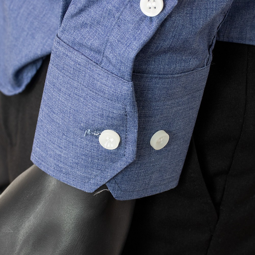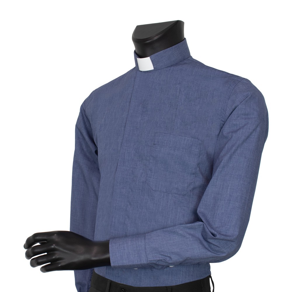 Queste camicie clergy sono a manica lunga realizzate in misto cotone tinta unita colore blu effetto jeans. Sono con taglio classico, bottoni e asole in tinta.