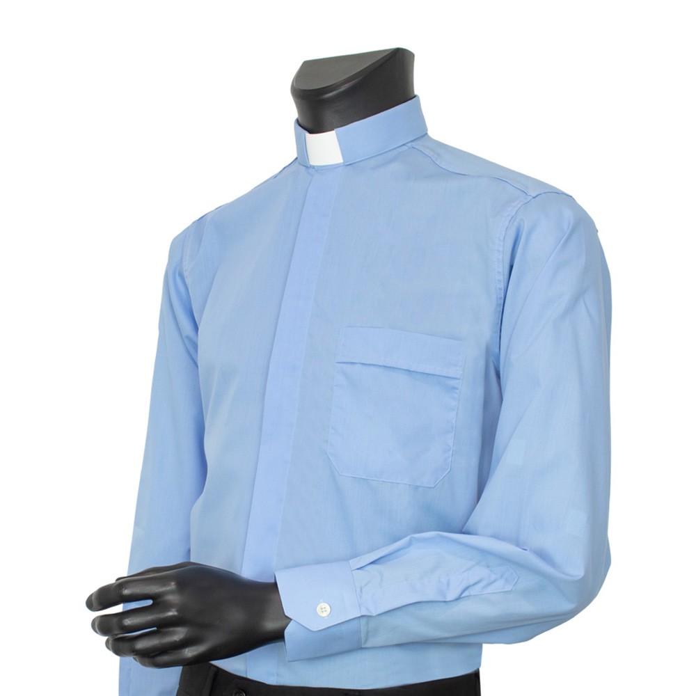 Camicia clergy in pregiato cotone marangel, disponibile color celeste e grigio chiaro.