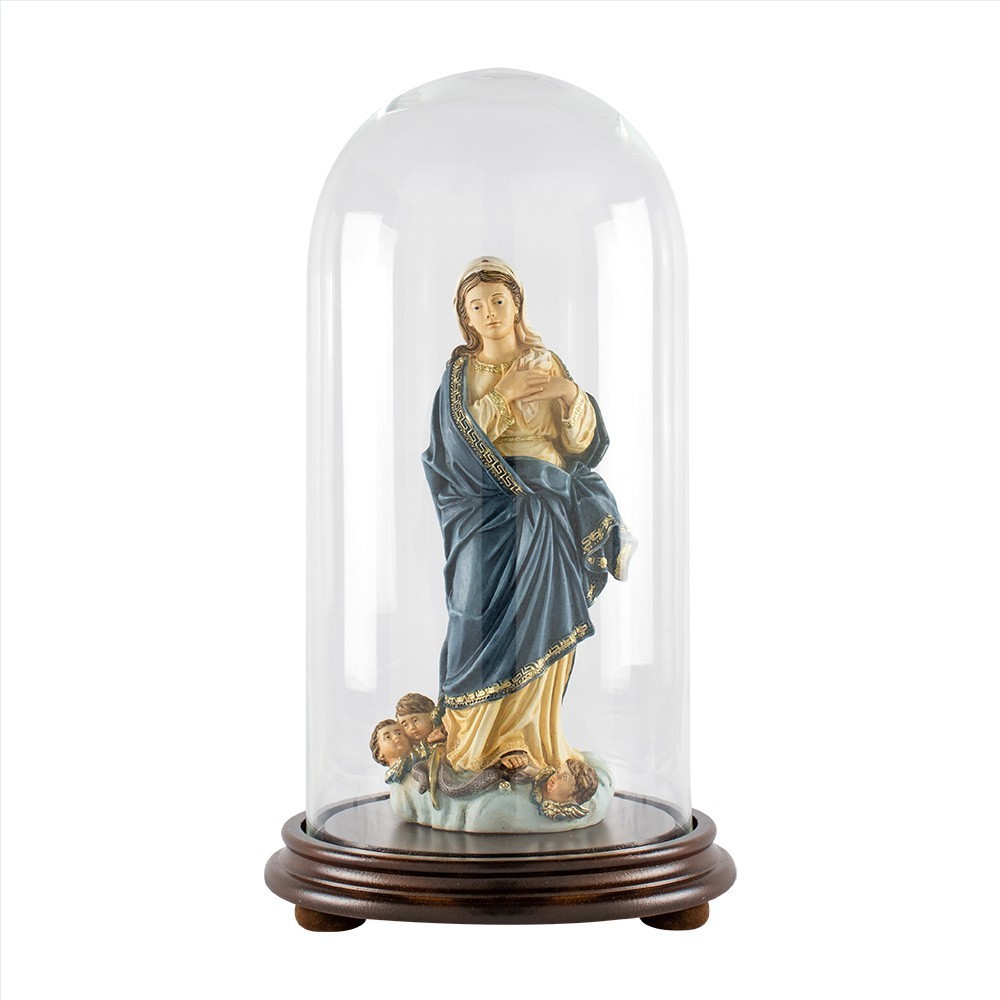 Campana in vetro soffiato tonda con base in legno. Queste campane sono adatte per essere utilizzate per la protezione di Santi, delle Sante, delle Madonne e di Gesù.