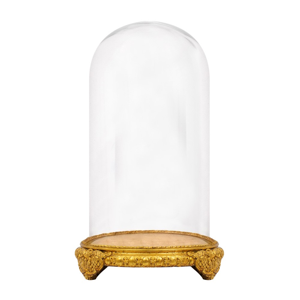 Cupola di vetro tonda con base oro intagliata.