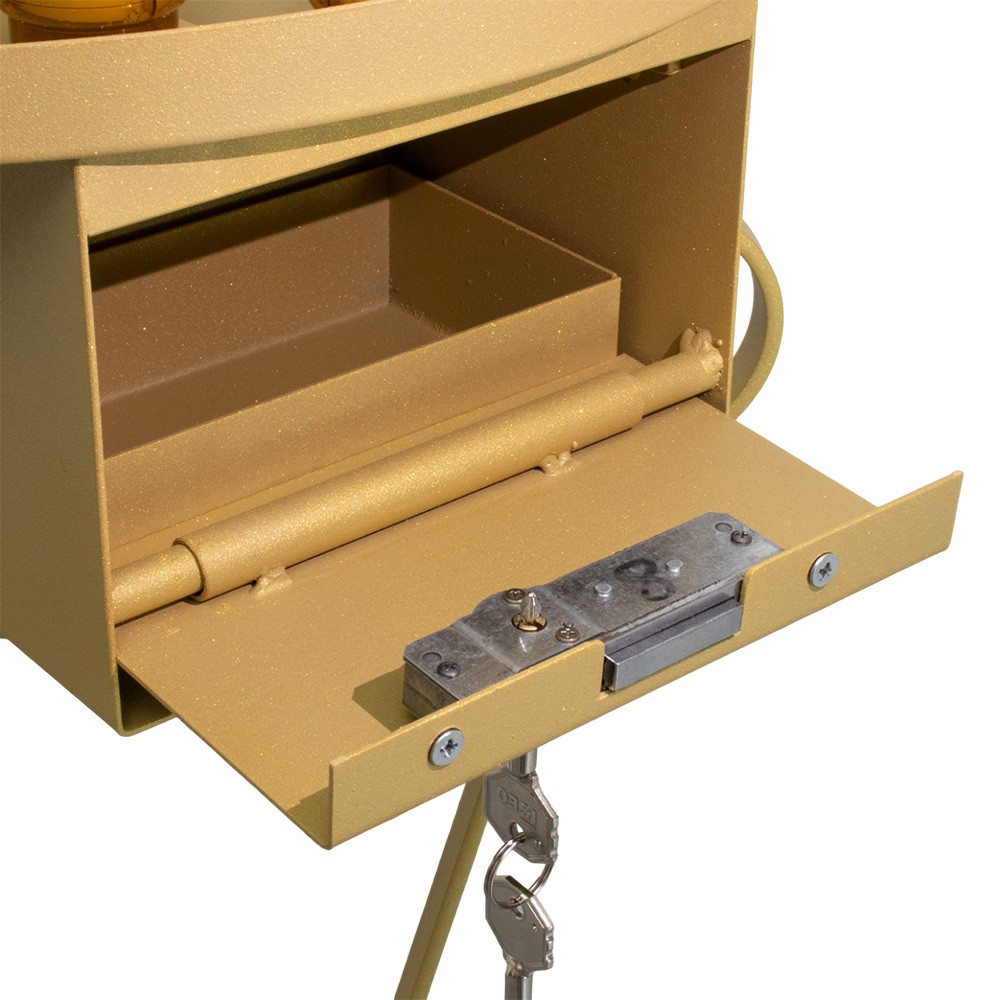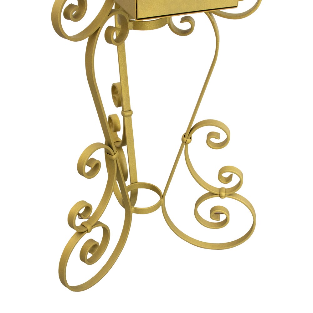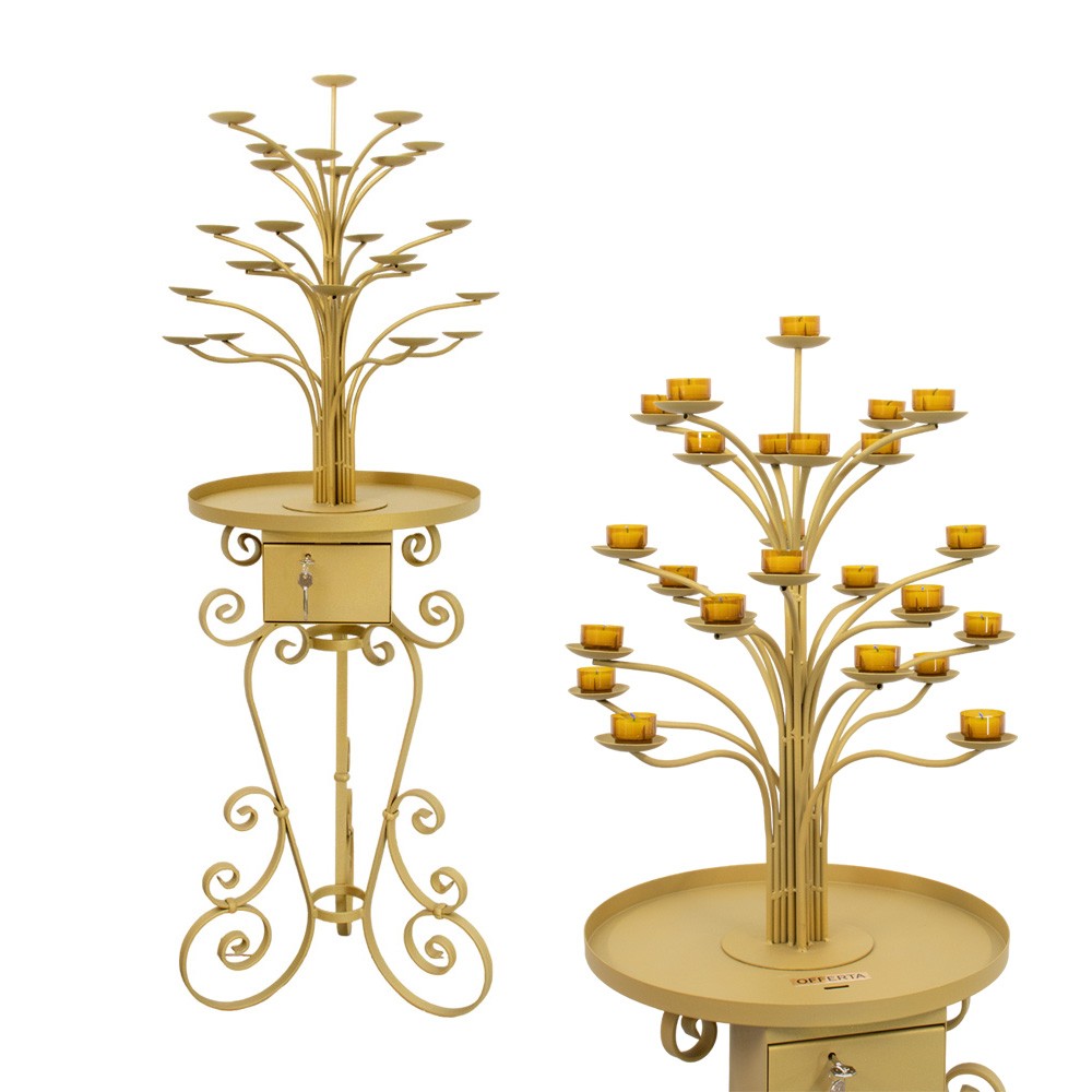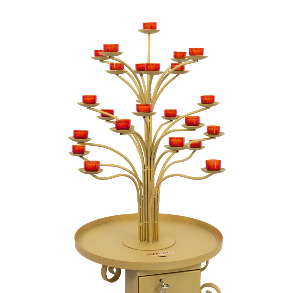 E' realizzato interamente in ferro con vernice oro duratura e resistente nel tempo, inoltre dispone di una cassetta porta offerte con chiave di sicurezza e un appoggio circolare dove è possibile posizionare altri ceri.