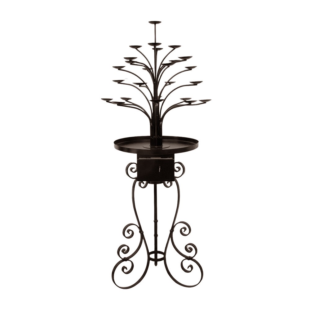 E' realizzato interamente in ferro con vernice color bronzo duratura e resistente nel tempo, inoltre dispone di una cassetta porta offerte con chiave di sicurezza e un appoggio circolare dove è possibile posizionare altri ceri.