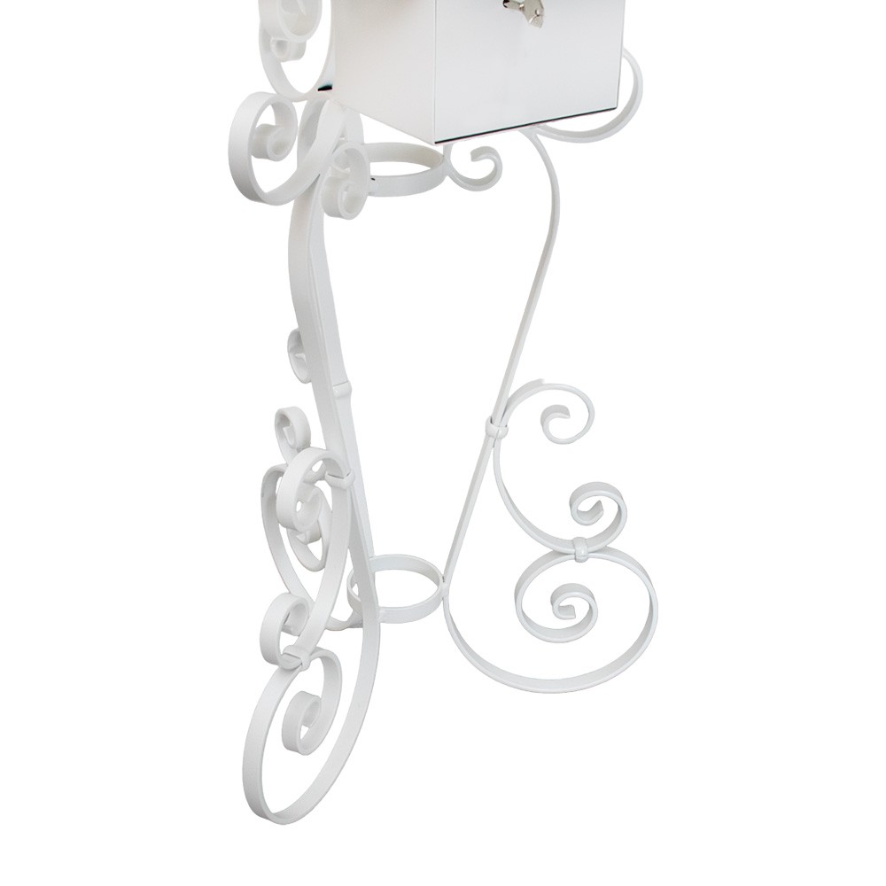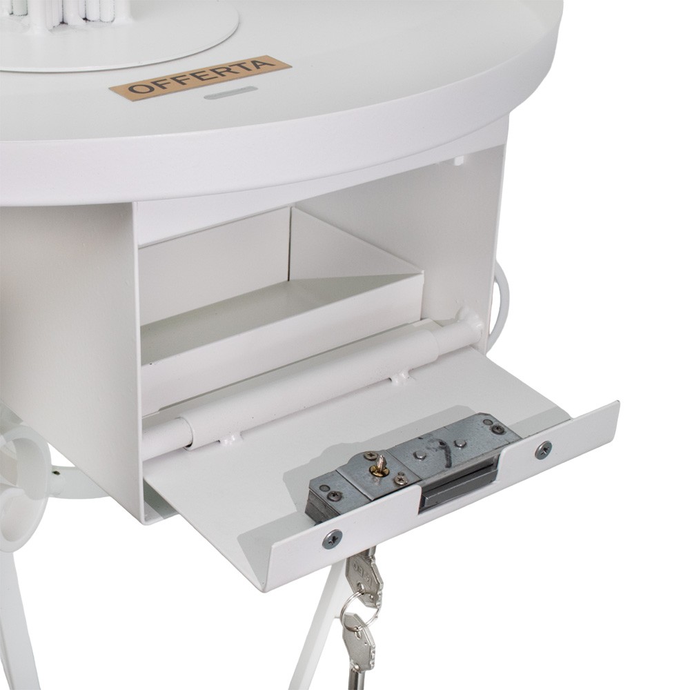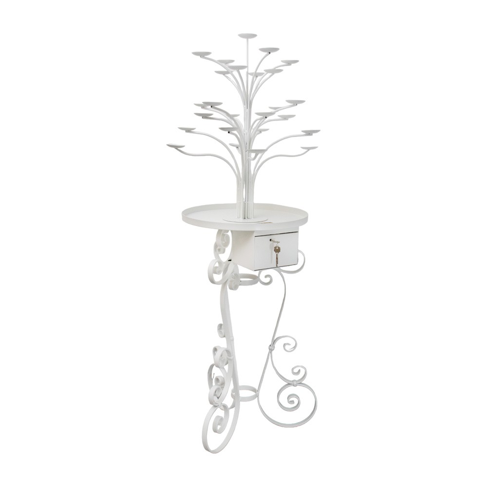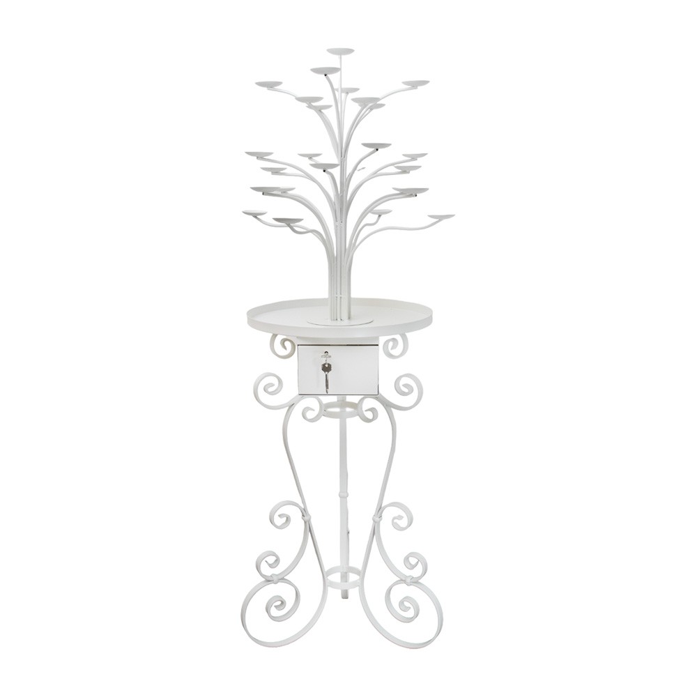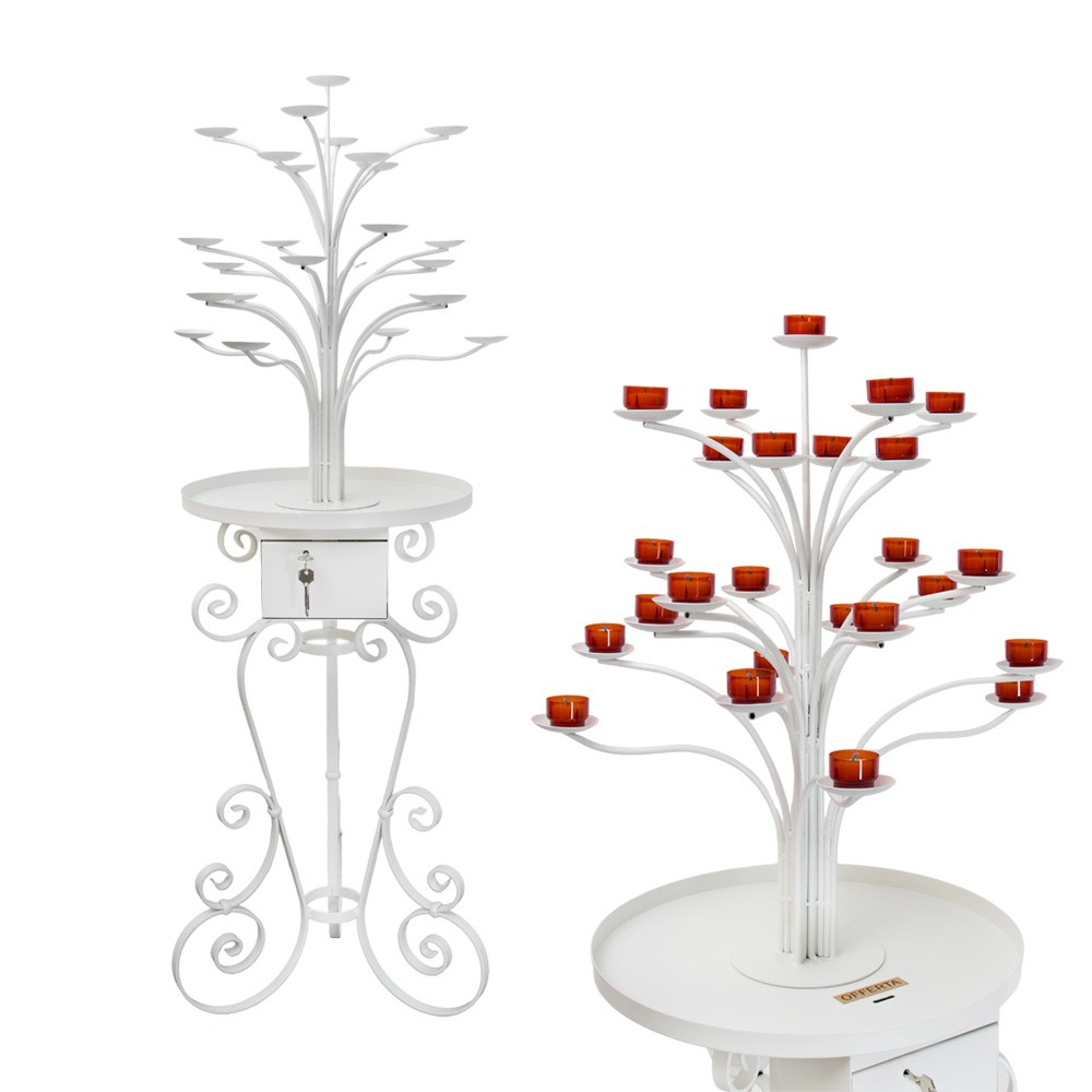 E' realizzato interamente in ferro verniciato di colore bianco duratura e resistente nel tempo, inoltre dispone di una cassetta porta offerte con chiave di sicurezza e un appoggio circolare dove è possibile posizionare altri ceri.