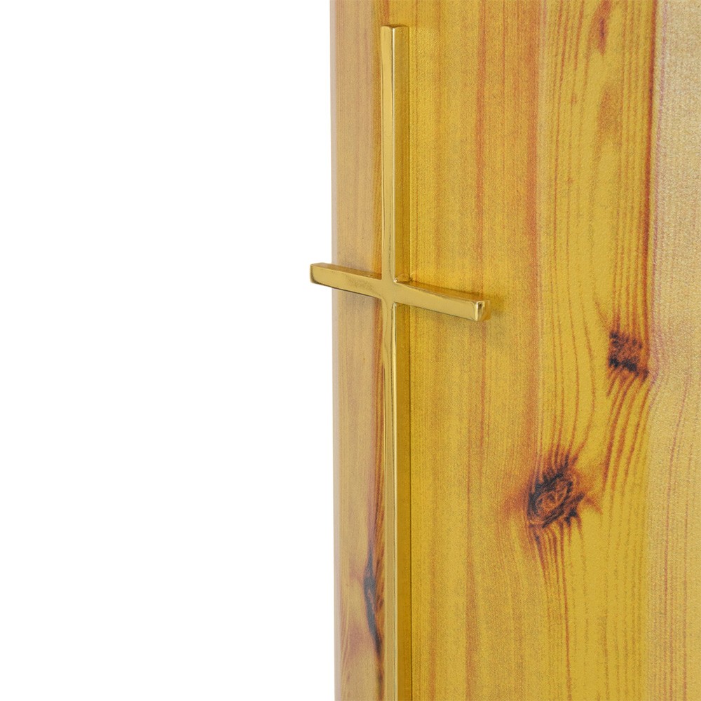 Il votivo è realizzato in legno naturale e croce decorata posta al centro della colonna.
