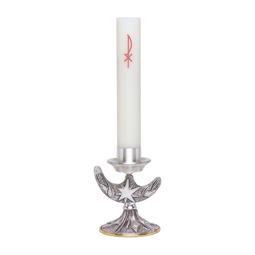 Candeliere da altare in bronzo 1 fiamma. I decori raffiguranti su questo carinissimo candeliere sono spighe, fiamme e stella. Completo di 1 fiamma. Questo articolo non contiene nikel ed è adatto per bossolo finta candela con diamentro massimo di 4 cm. L'altezza del candeliere è 14,5 cm.