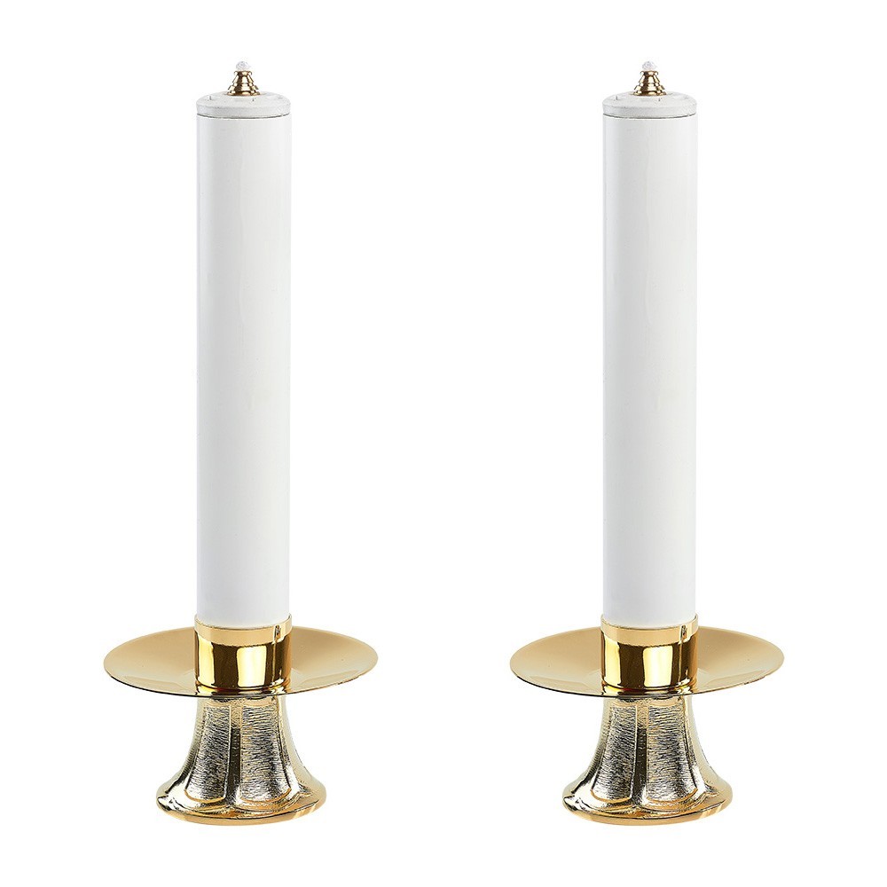 Coppia di candelieri per altare. Realizzati in ottone con fusione dorata. Completi di finta candela e cartuccia. Articolo di produzione italiana.