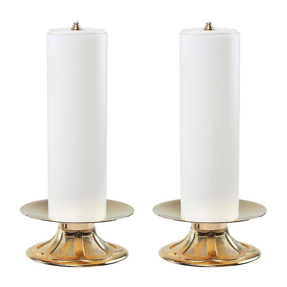 Coppia di candelieri da altare in ottone dorato. Completi di finte candele e cartucce. Articolo di ottima qualità, eseguito interamente in Italia.