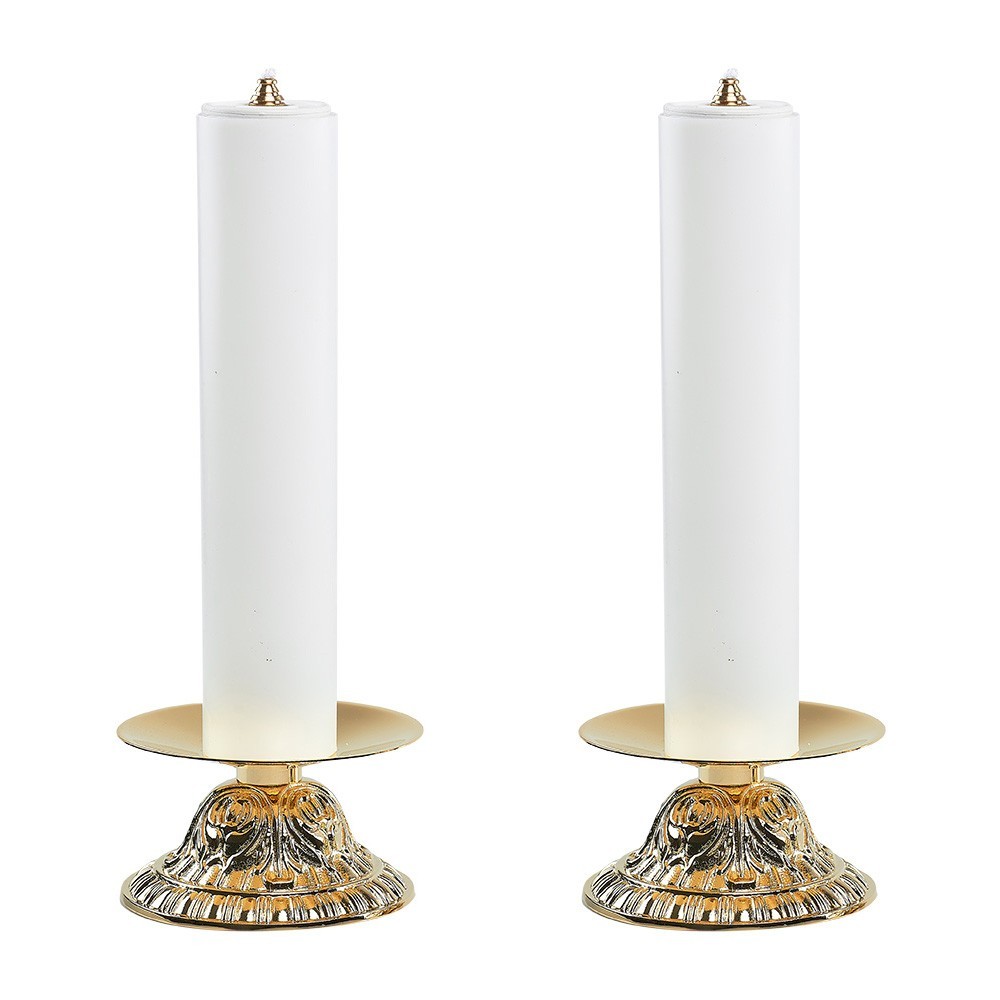 Coppia di candelabri da altare in ottone dorato. Completi di finte candele e cartucce. Articolo di ottima qualità, eseguito interamente in Italia, con la massima attenzione nei particolari.