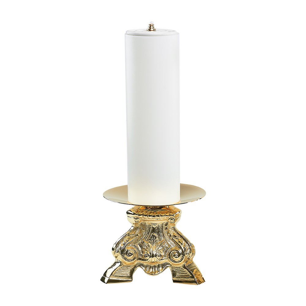 Candeliere in stile barocco ricco, alto 14 cm. Realizzato in ottone dorato. Il diametro del piatto è 15 cm e il bossolo per contenere la finta candela è di diametro 5 cm. Articolo made in Italy.