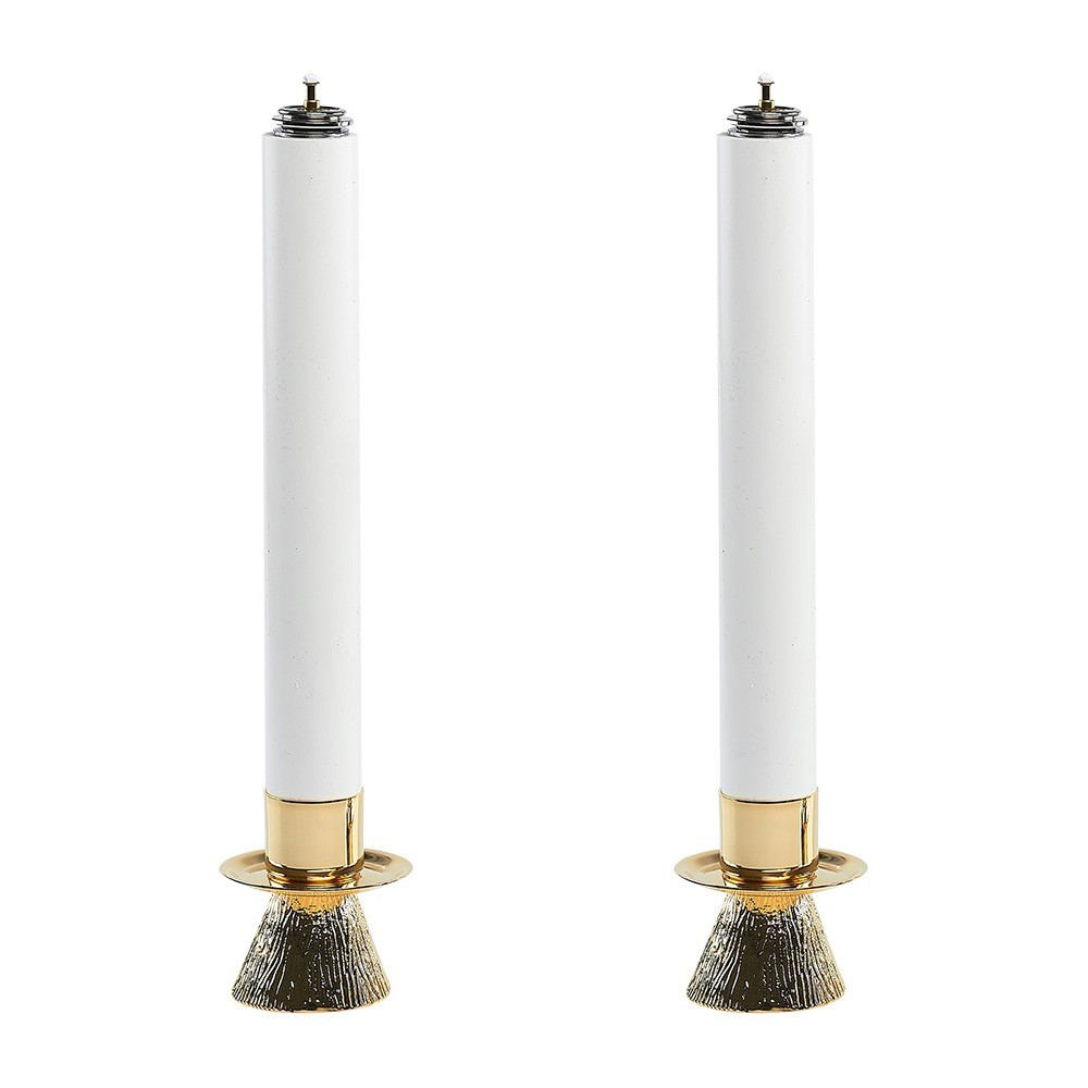 Coppia di candelieri da mensa completi di finte candele e cartucce. a cera liquida. I candelieri sono interarmente in ottone con base decorata. Produzione 100% italiana.