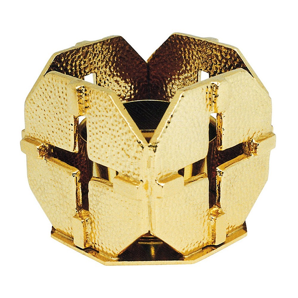 Candeliere da altare in ottone dorato. Il candeliere ha una forma quadrata ed è decorato sui lati con trafori a forma di croce.
