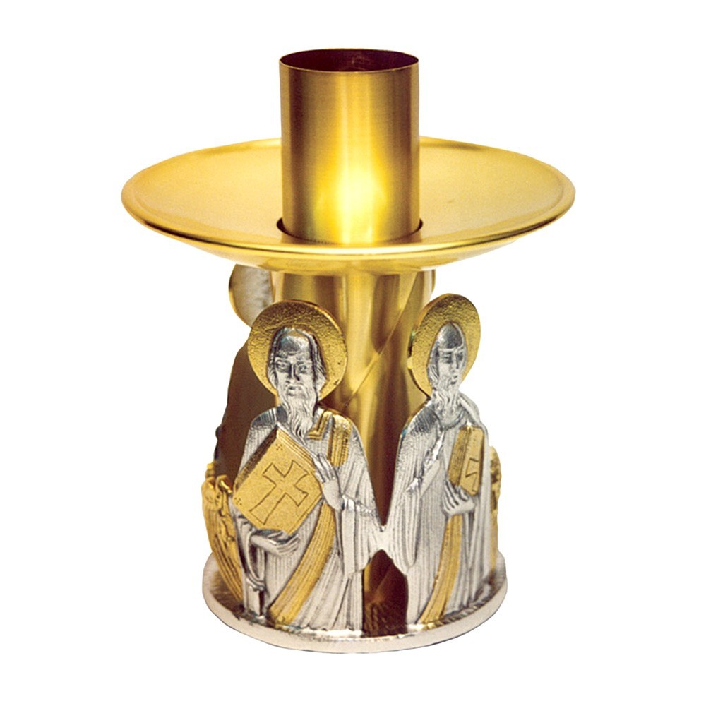 Questo candeliere è in ottone bicolore ed è decorato con una raffigurazione a rilievo dei quattro Evangelisti.
