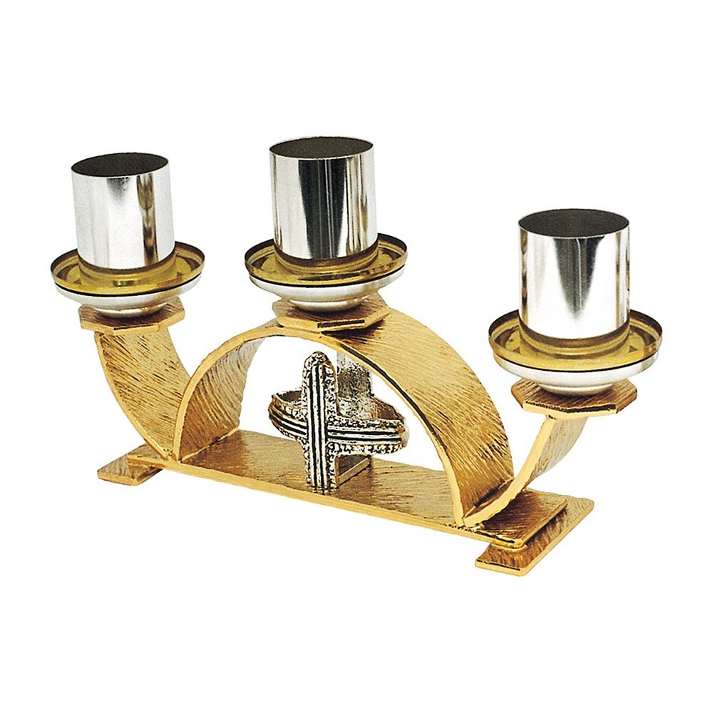 Candeliere a tre fiamme in ottone bicolore. La base del candeliere è decorata con una croce argentata. Articolo di ottima qualità, realizzato interamente a mano.