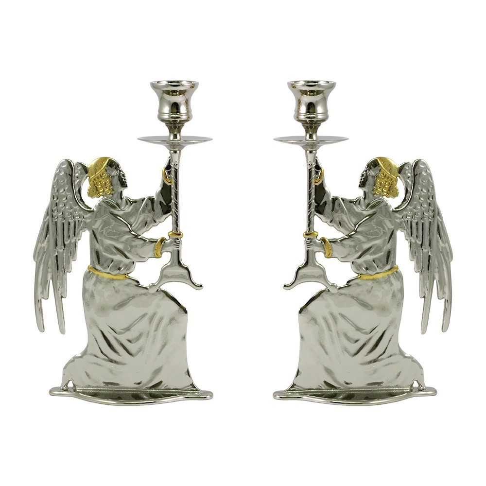 I candelieri si presentano con angelo inginocchiato che sostiene con entrambi le mani il candelabro. Realizzati in ottone tono argento con angelo bicolore oro 24k e Nichel.