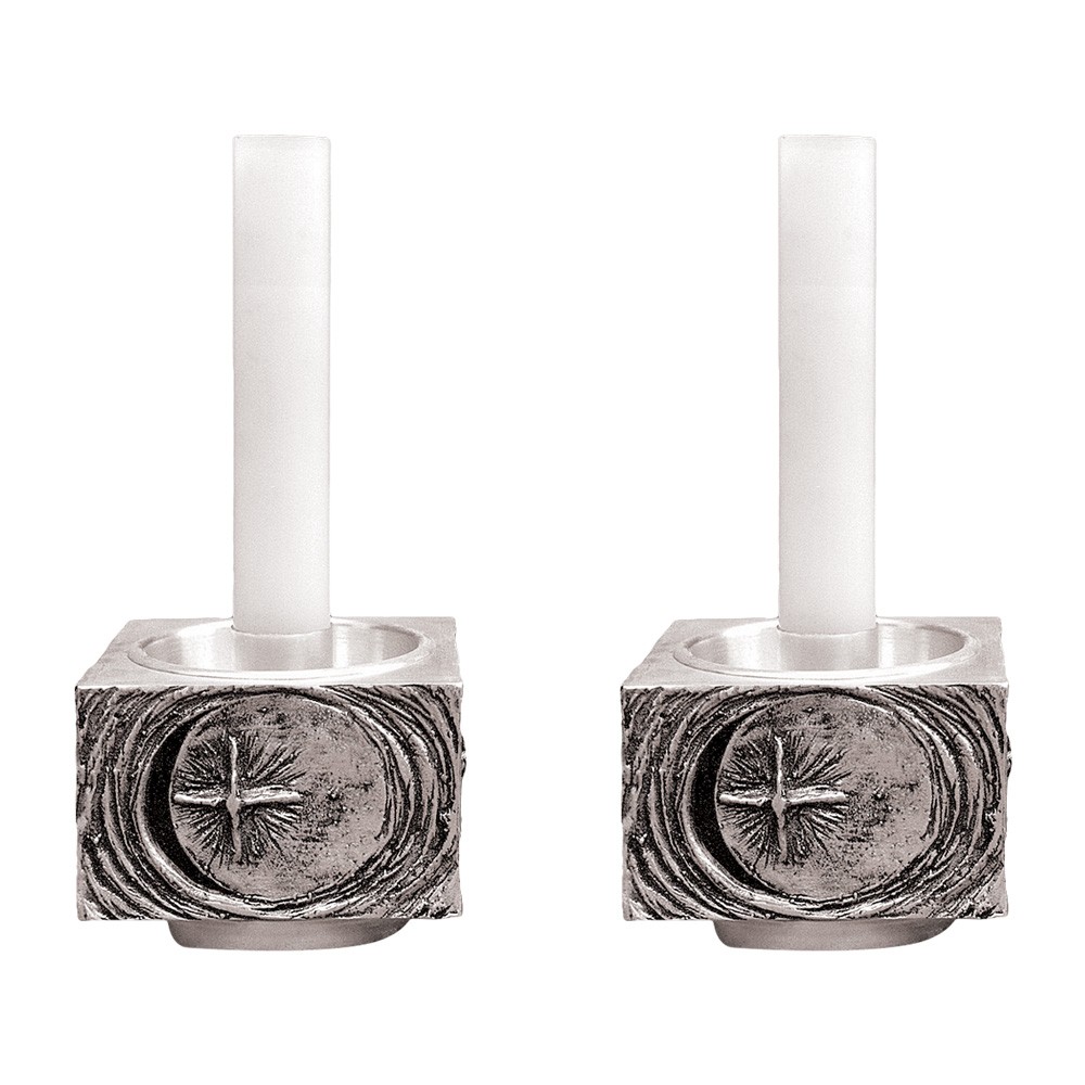 Coppia candeliere da mensa "serie quadrata", realizzata in ottone in fusione argento, adatte a contenere finte candele di diametro massimo 4 cm. Made in Italy.