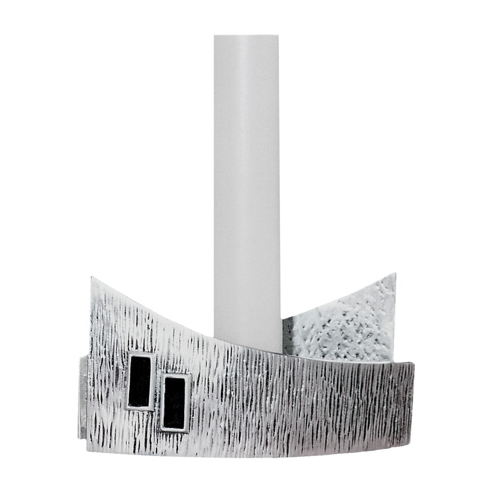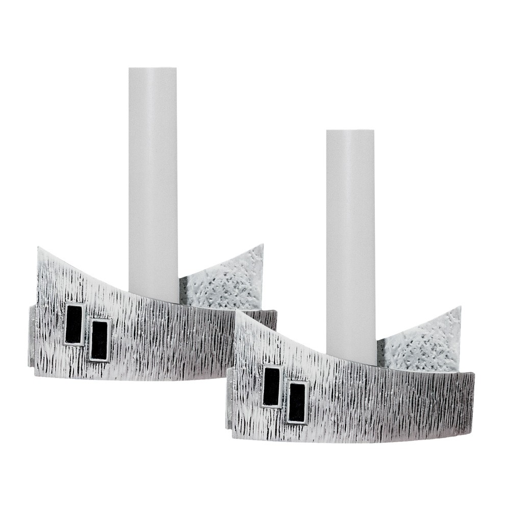 Coppia di candeliere da altare stile moderno, realizzati in ottone con finitura argento e smalti. I candelieri sono adatti a contenere finte candele di diametro massimo 4 cm. Made in Italy.