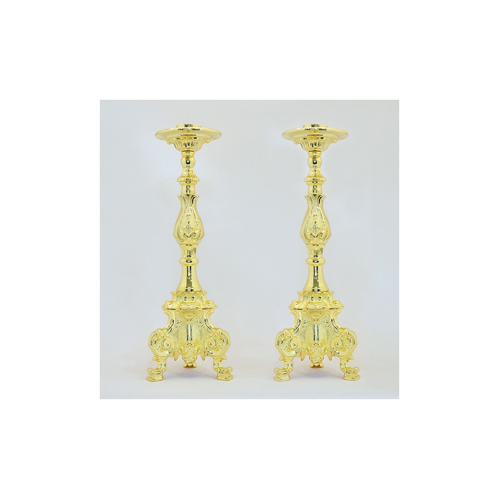 Candelieri in ottone dorato, su richiesta anche argentato, modello "Rococò" con bossolo (diametro 3,5) per candela in cera o finta candela a cera liquida, è possibile inoltre, su preventivo, realizzarle con impianto elettrico. Questo arredo sacro è ideale per processioni. Il prezzo si intende per la coppia di candelabri d'altare, senza finta candela. Puoi scegliere l'altezza della finta candela sul nostro sito nella sezione dedicata.