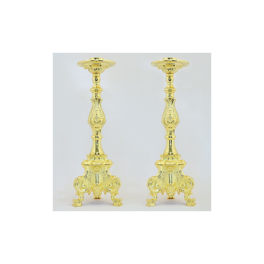Candelieri in ottone dorato, su richiesta anche argentato, modello "Rococò" con bossolo (diametro 4) per candela in cera o finta candela a cera liquida, è possibile inoltre, su preventivo, realizzarle con impianto elettrico. Questo arredo sacro è ideale per processioni. Il prezzo si intende per la coppia di candelabri d'altare, senza finta candela. Puoi scegliere l'altezza della finta candela sul nostro sito nella sezione dedicata.