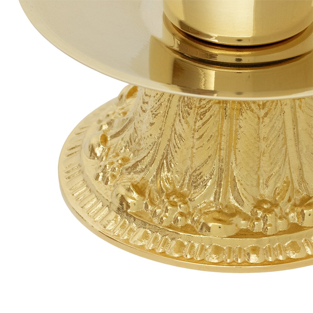 Il candeliere è realizzato in ottone finitura dorata 24k, completo di piattino paracera e bossolo portacandela di diametro 4 cm.