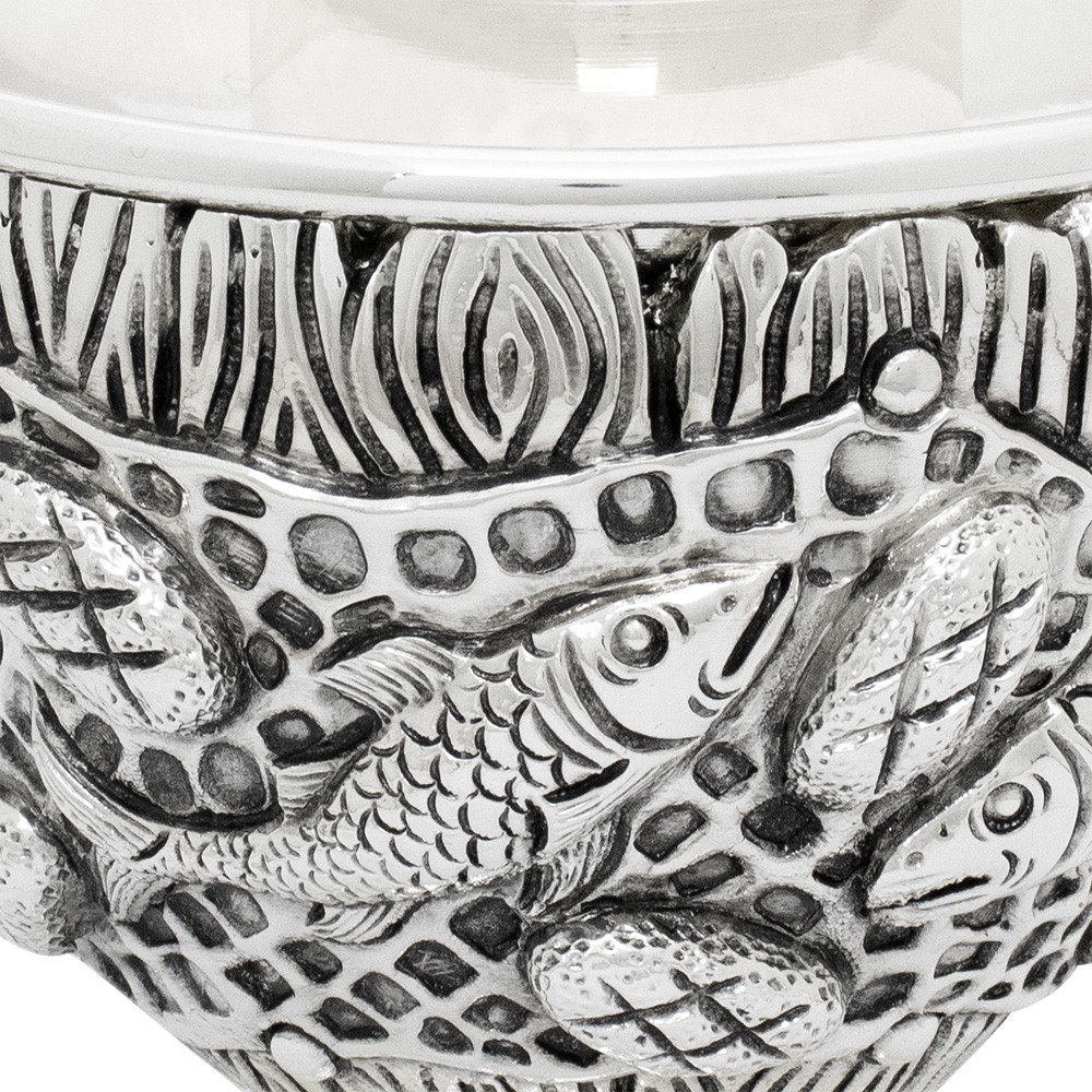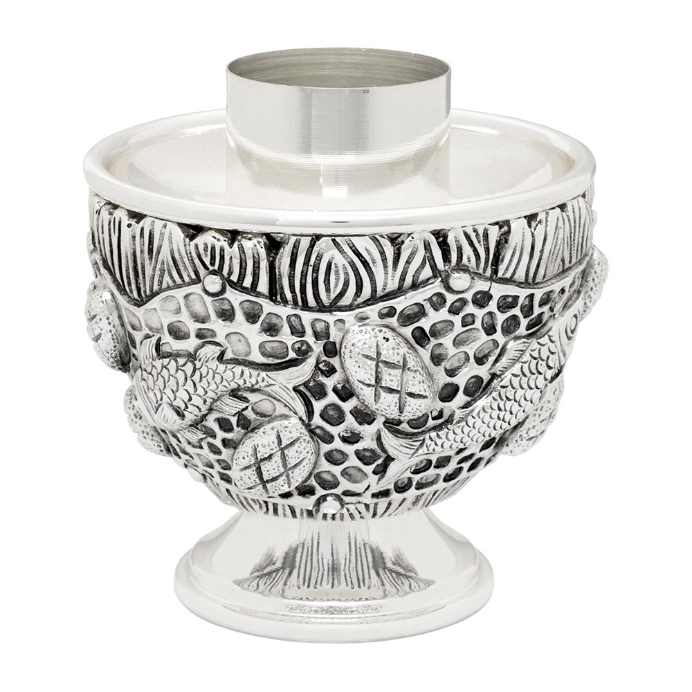Candeliere con bossolo (Ø 4 cm) finemente decorato "Pane e Pesci" il tutto realizzato in ottone con finitura argentata.