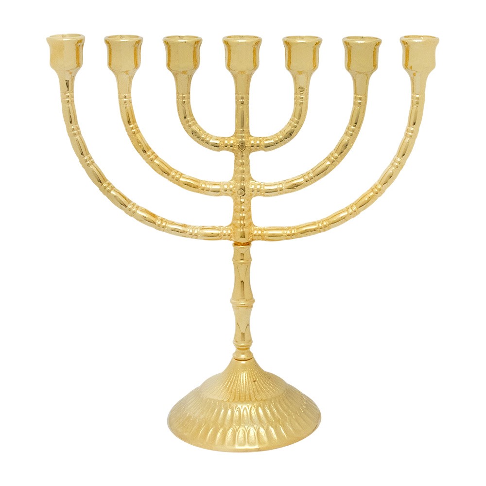 Candeliere liturgico a sette fiamme realizzato in ottone con finitura oro lucido.