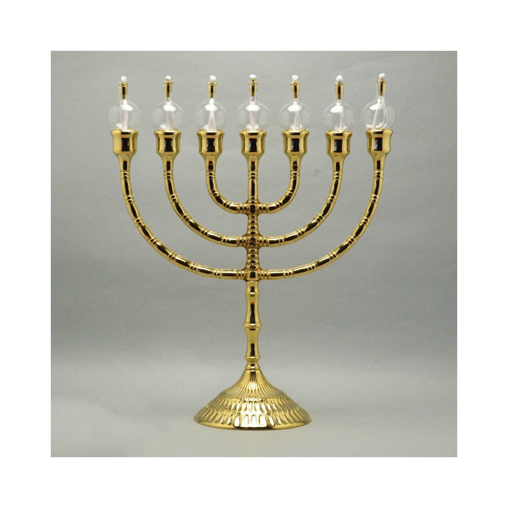 Candelabro Menorah a sette fiamme in ottone dorato con ampolle in vetro soffiato per cera liquida. Completo di stoppino e gigler. E' alto 28,5 cm. Prodotto interamente made in Italy, garantendo materiali di prima scelta.