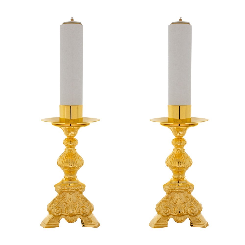 Candelieri per altare in ottone lucido, alti 25,5 cm.