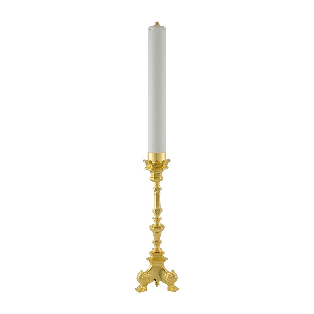 Coppia di candelieri da altare in stile Barocco. I candelieri sono realizzati in ottone dorato con bossolo per finta candela diametro 4 cm. Prodotto interamente lavorato e realizzato da un'azienda italiana.