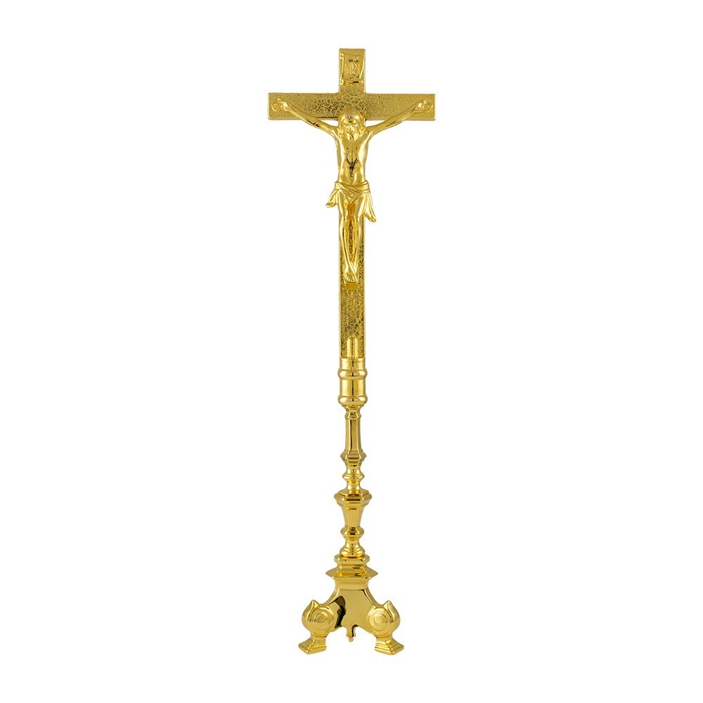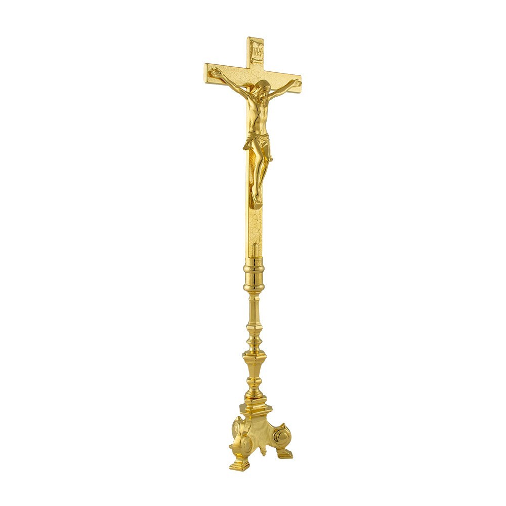 Croce su candeliere da altare in stile Barocco. Realizzato in ottone con finitura dorata, misura totale 57 cm ca cm di altezza. Croce da altare interamente lavorata e realizzata da un'azienda italiana.