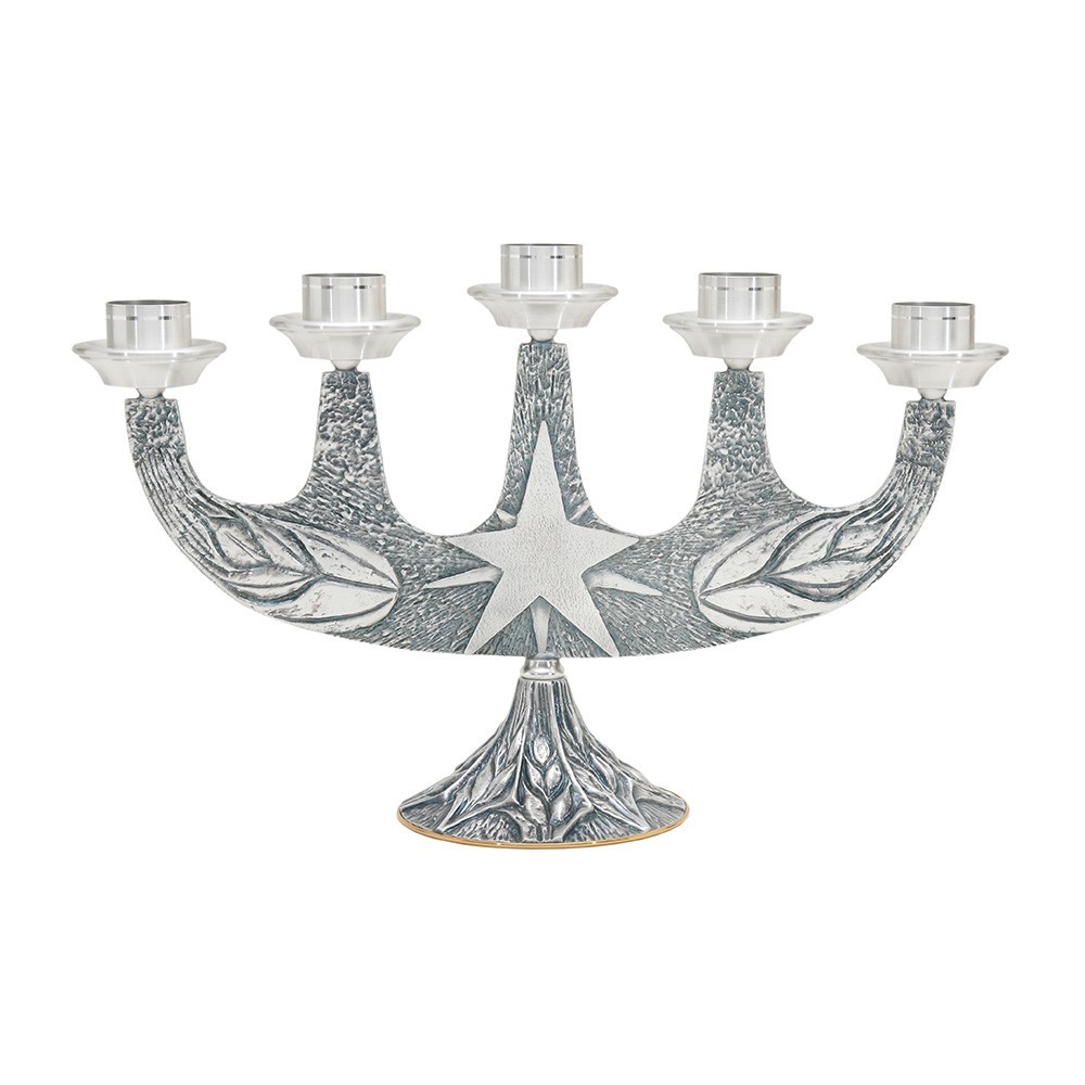 Il candeliere da altare è realizzato interamente in bronzo con decori raffiguranti stella, spighe e fiamme. Completo di 5 fiamme.Non contiene nikel. Made in Italy.