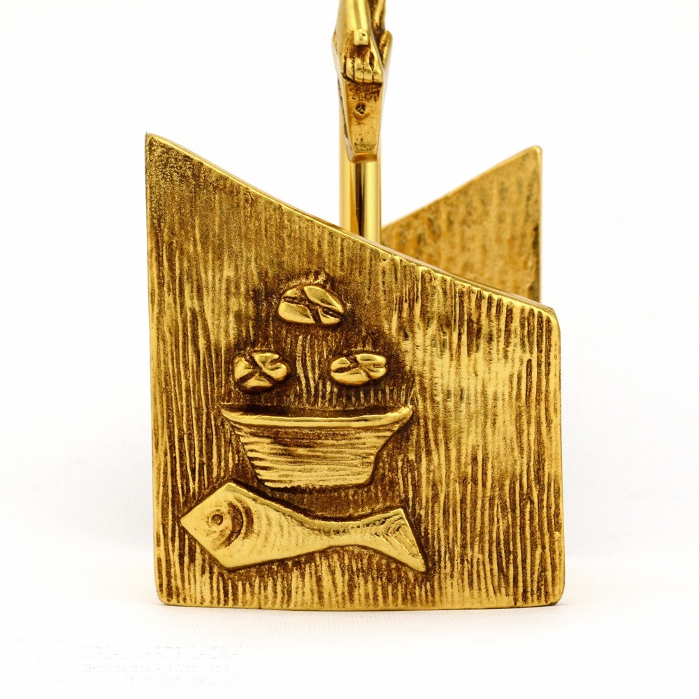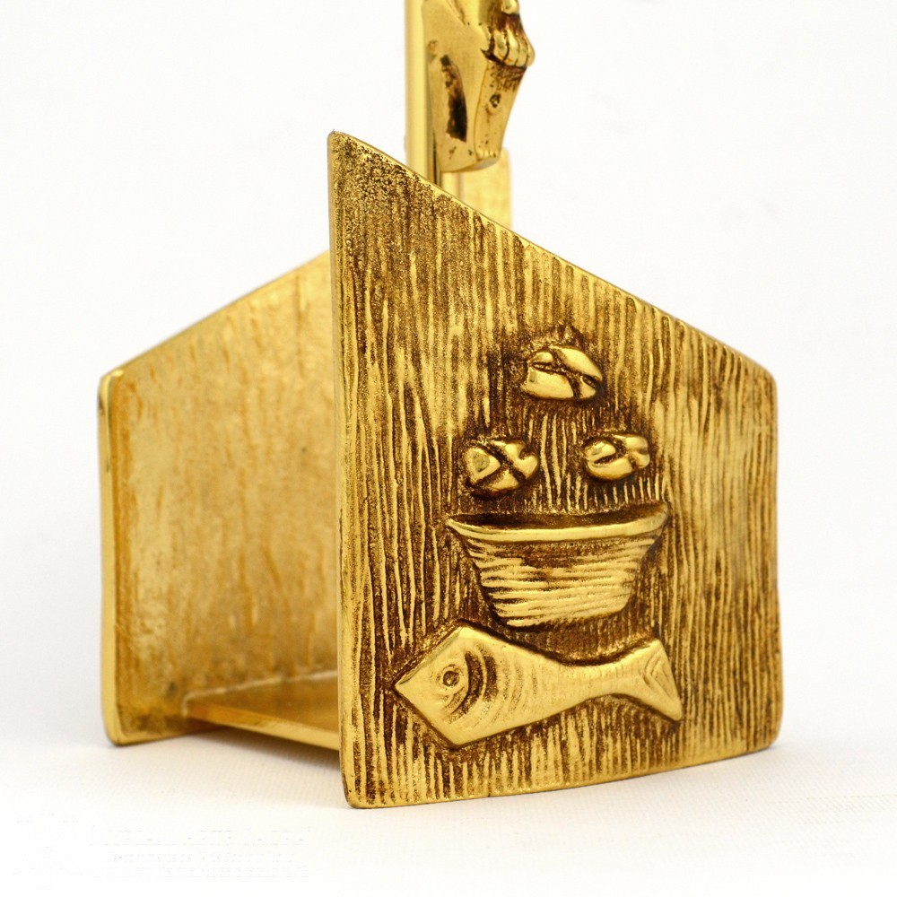 Croce altare in ottone dorato con pressofusione simbolo "pane e pesci". Disponibili candelieri abbinati.