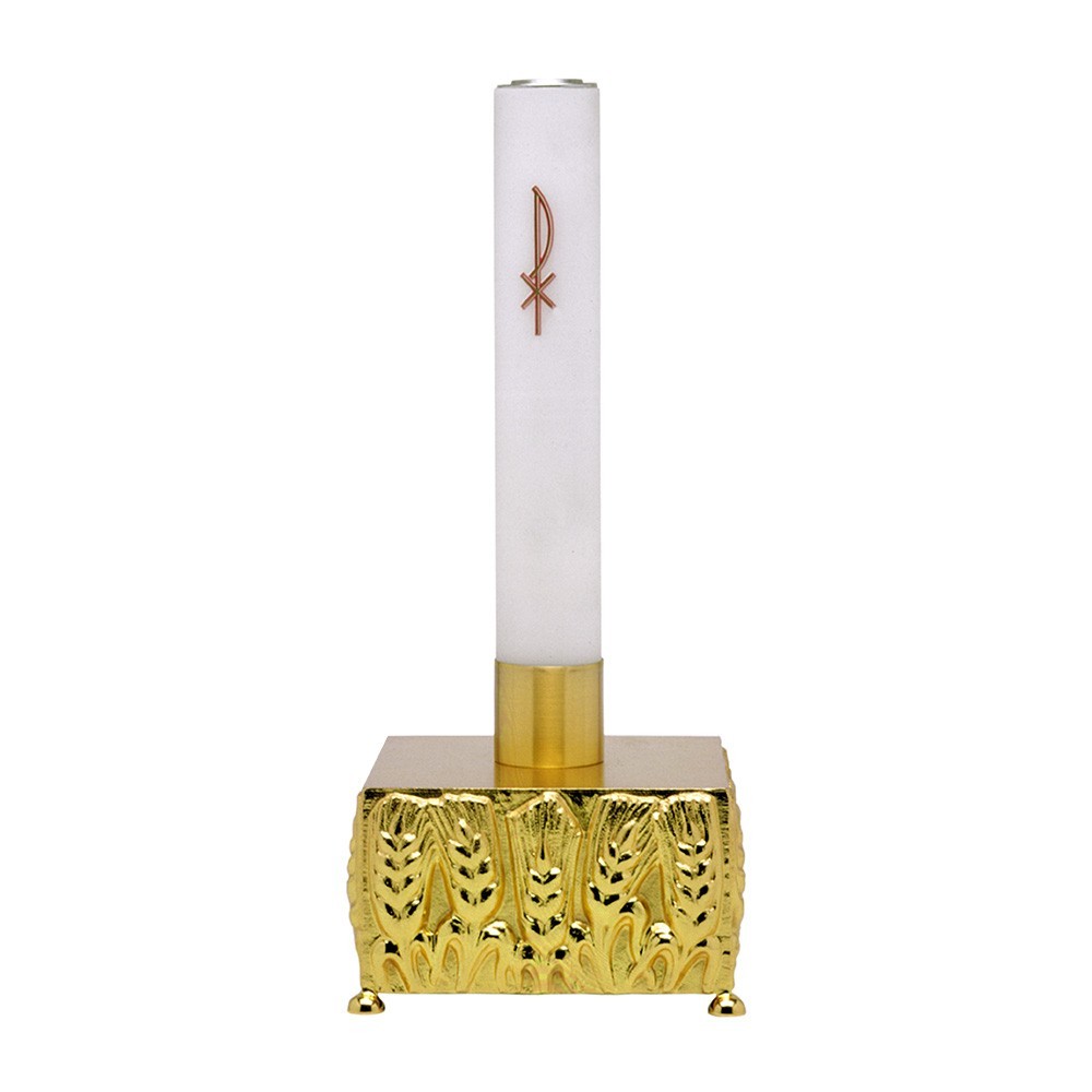 Candeliere da altare in ottone dorato con fusione raffigurante spighe di grano. Articolo di ottima finitura eseguito interamente da un'azienda italiana.