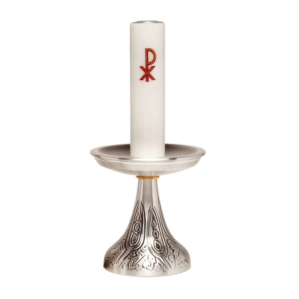 Candeliere da altare in metallo argentato.