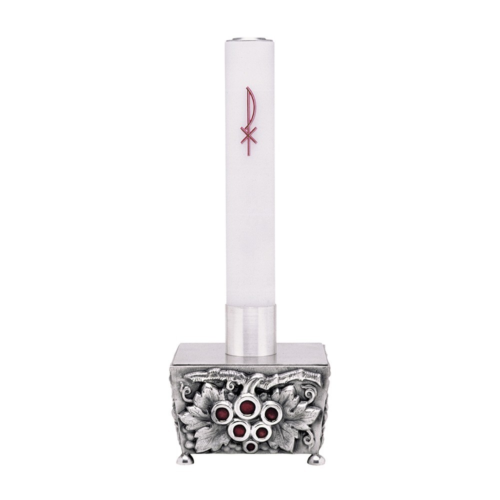 Questo bellissimo candeliere da alltare è interamente in bronzo con finitura argento, decorato con grappoli d'uva e smalto rosso. Non contiene nikel. Prodotto esegutio da una ditta italiana, garantendo materiali e lavorazione di prima qualità.