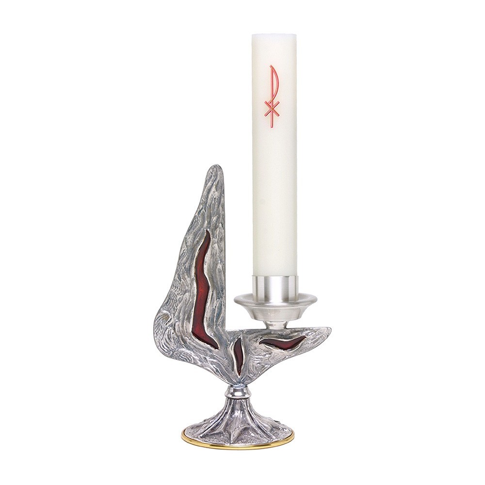Questo grazioso candeliere da chiesa è finemente decorato con stella, spighe e fiamme. Realizzato in bronzo con finitura bicolore oro e argento. L'altezza del candeliere è 25,5 cm, la larghezza è 16 cm. Produzione italiana, di ottima qualità.