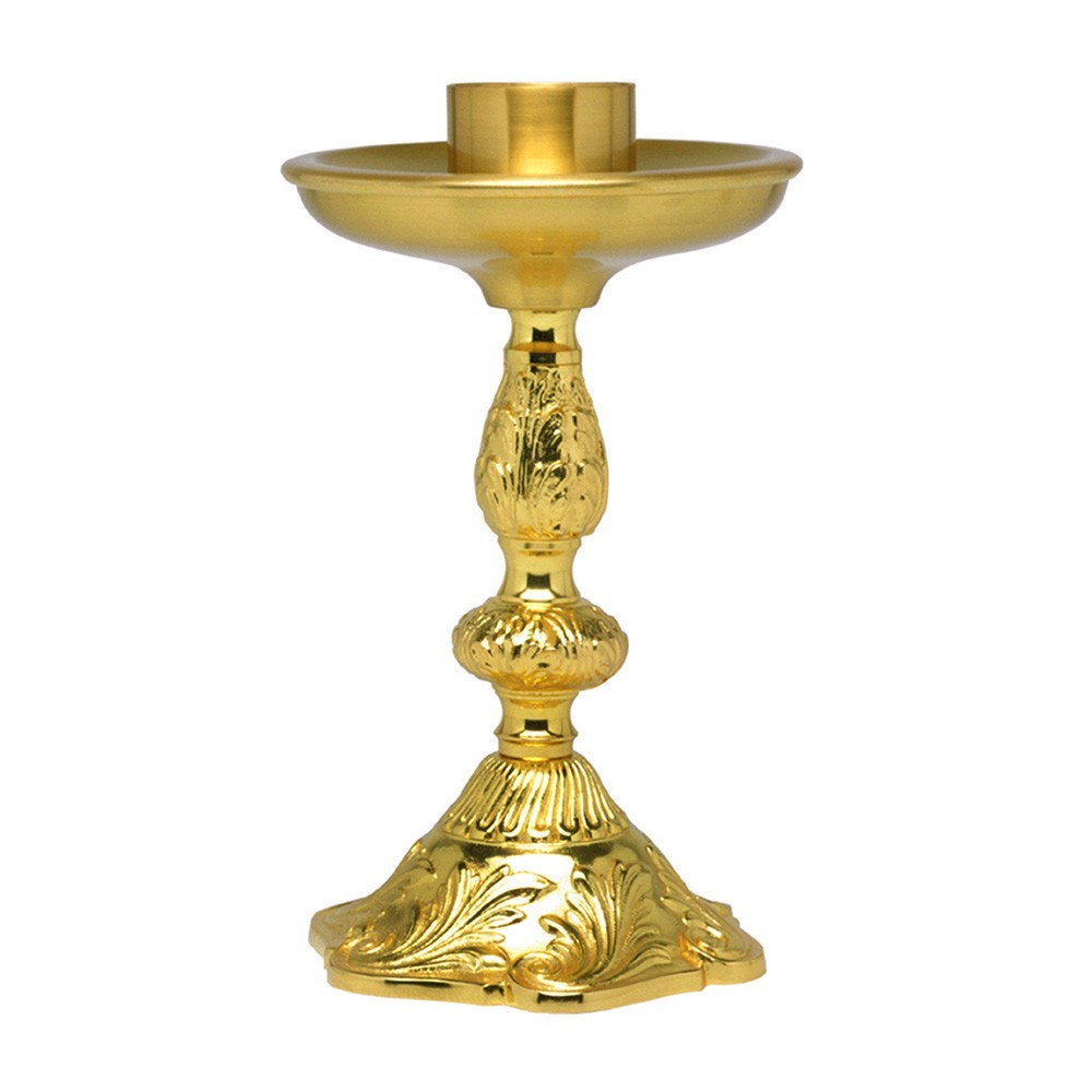 Candeliere da altare realizzato interamente in metallo dorato. Adatto per finta candela con diametro massimo 4 cm. Made in Italy.