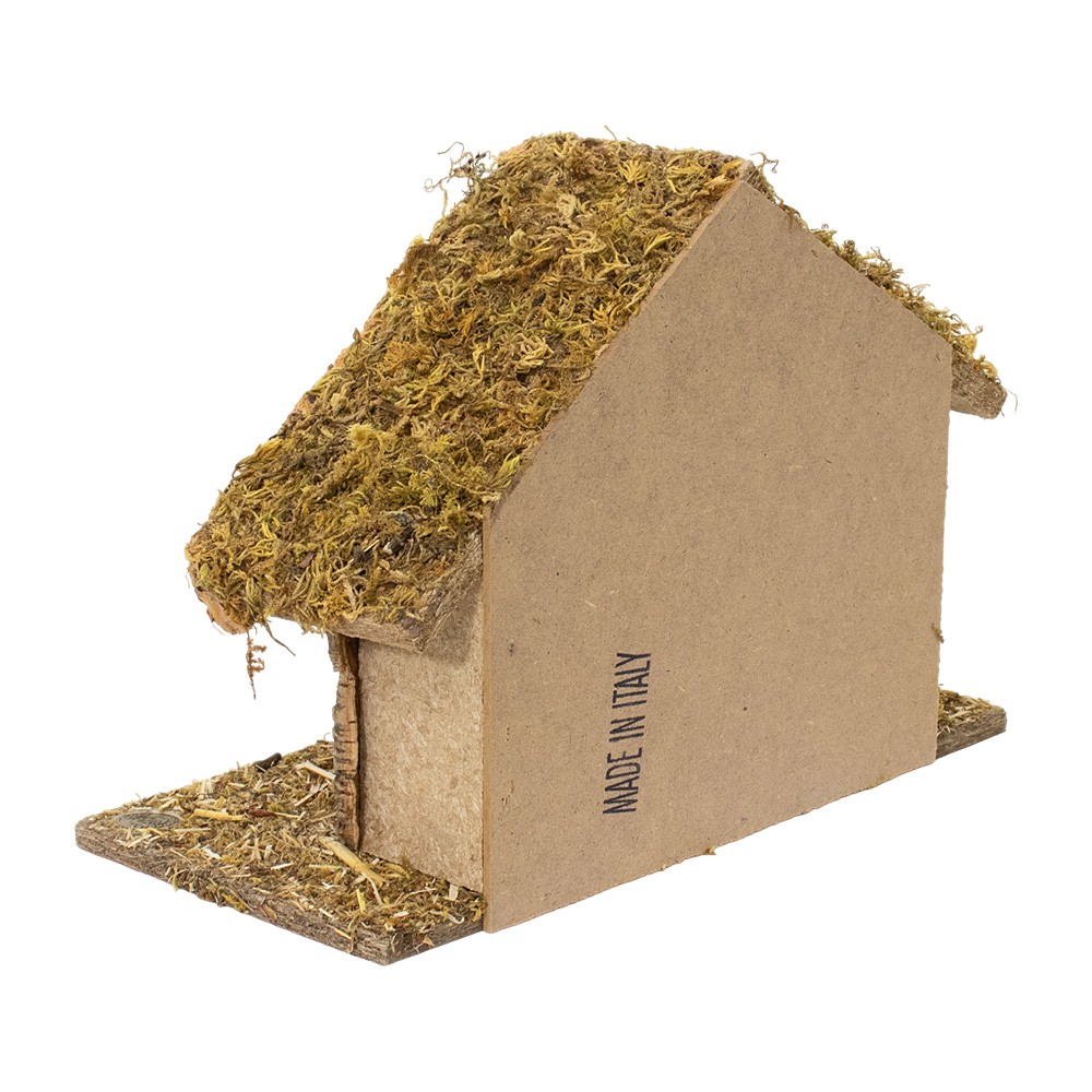 Capanna artigianale, prodotta in legno e sughero dalla Fontanini, con applicazioni di muschio.