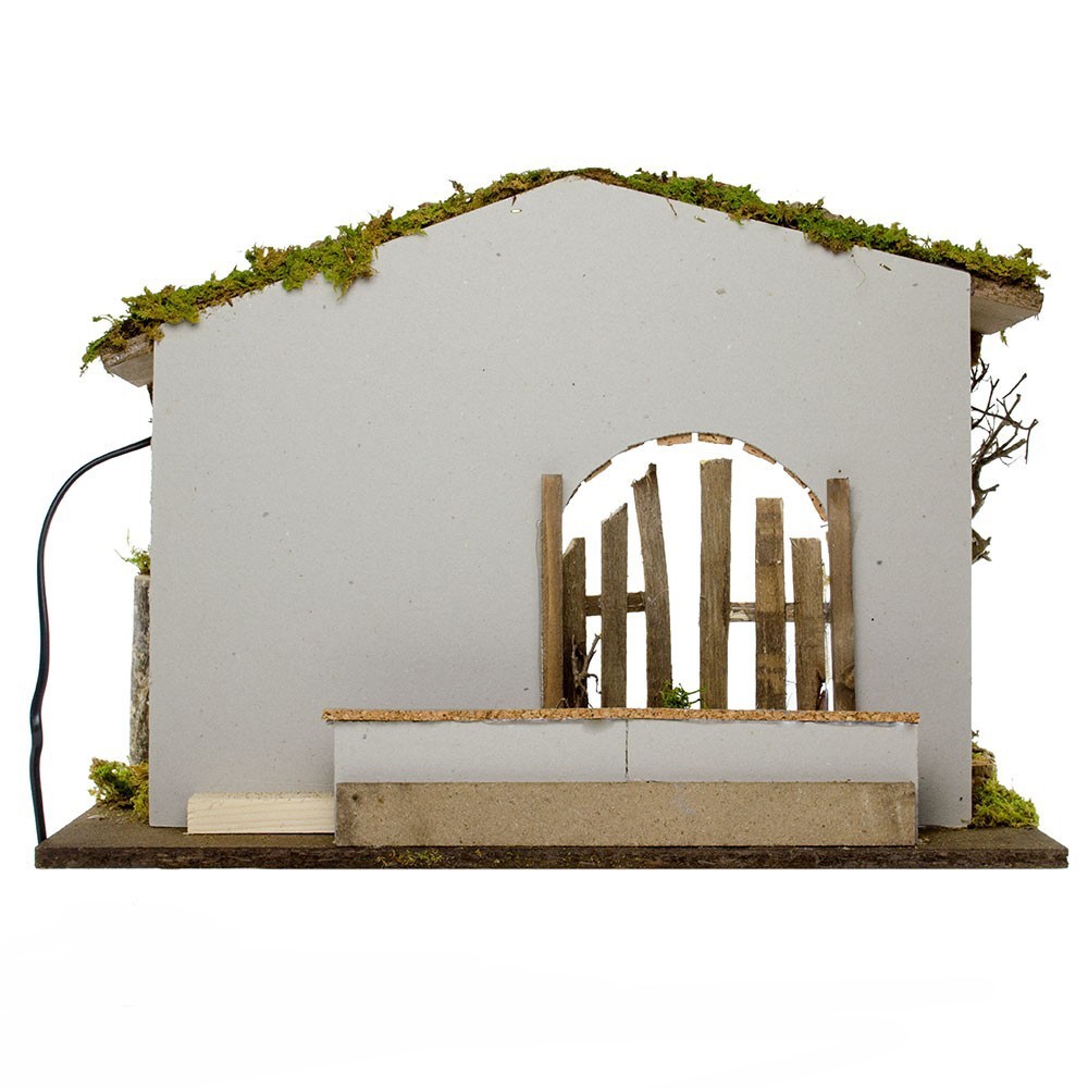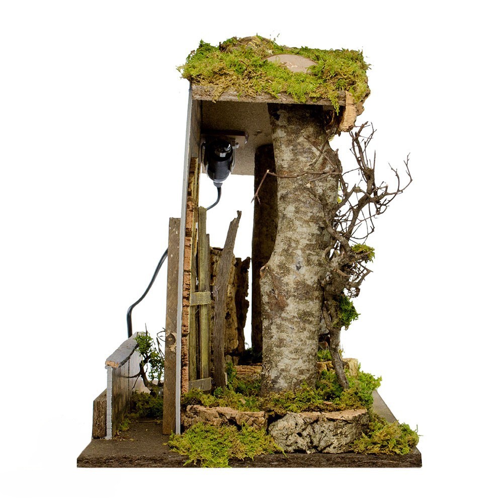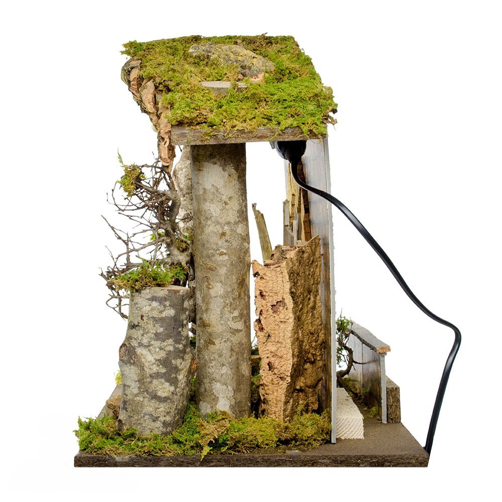 La capanna è stile rustico realizzata con base in legno ed è arricchita con muschio e tronchi d'albero. Completa di luce collegata ad una spina bipolare 220 Volt. Adatta a personaggi del presepe con altezza 10 - 12 - 15 cm.