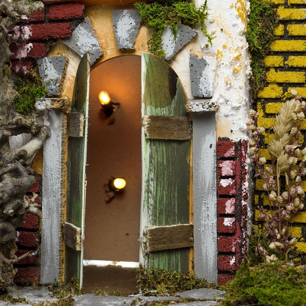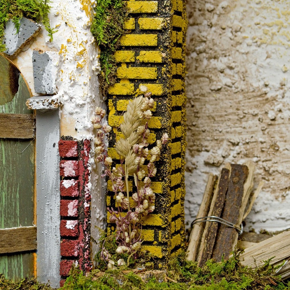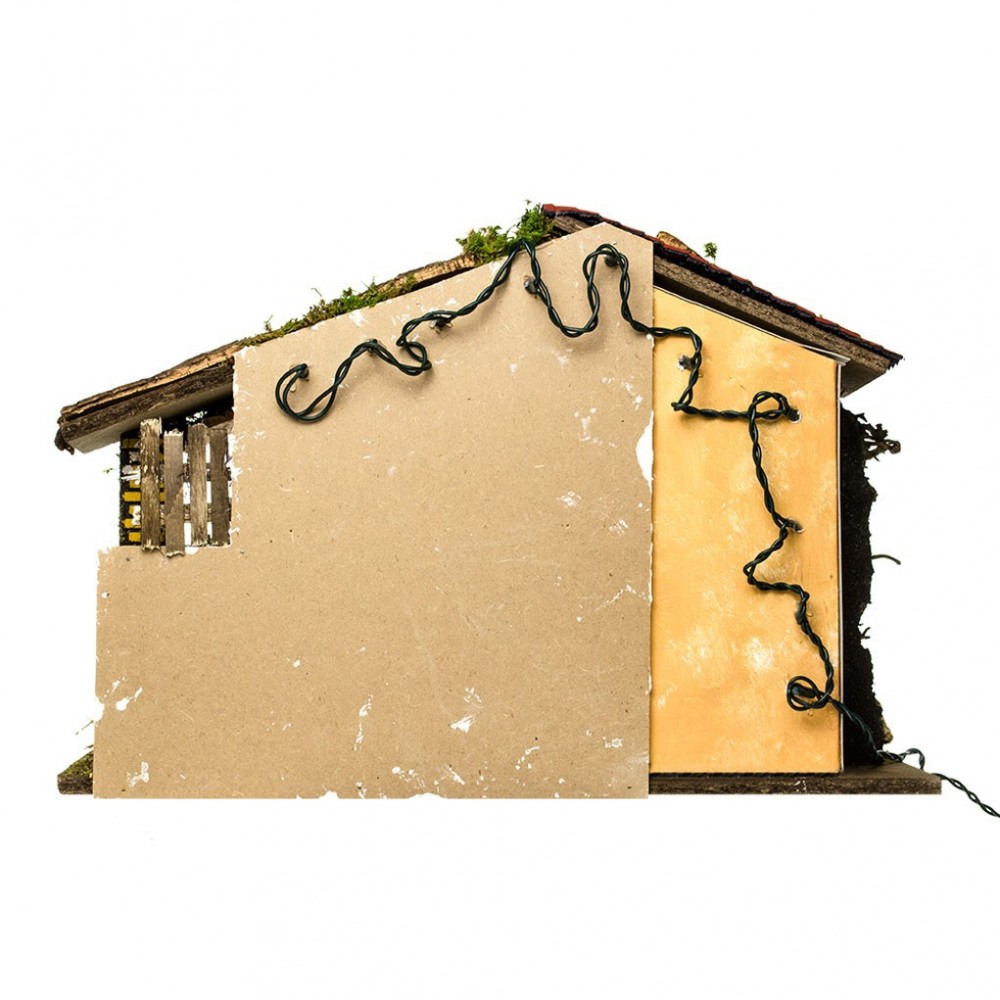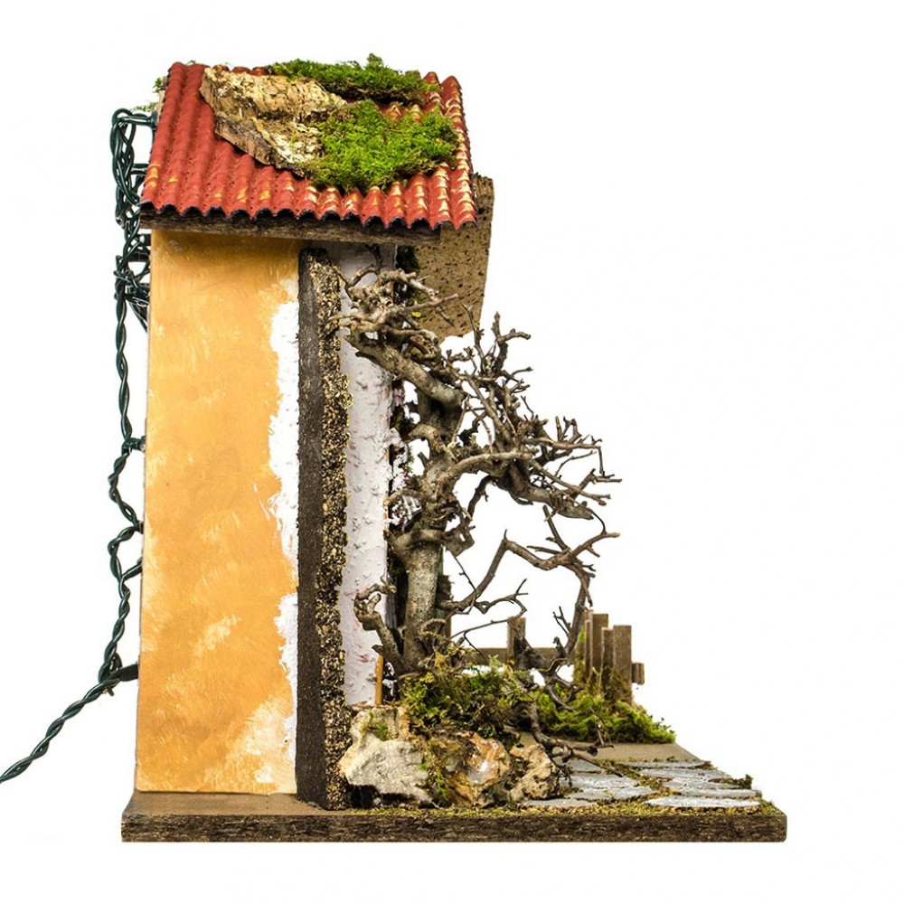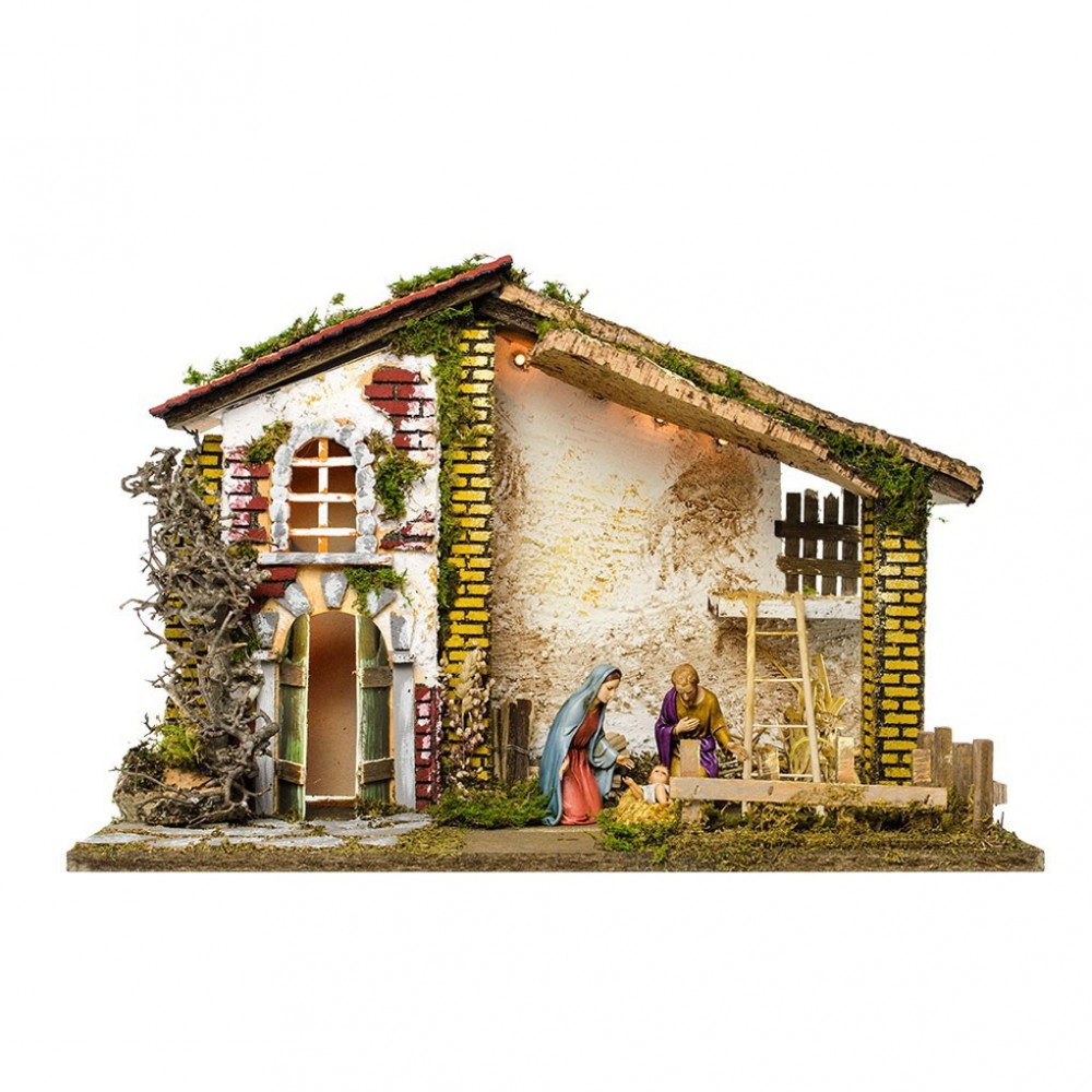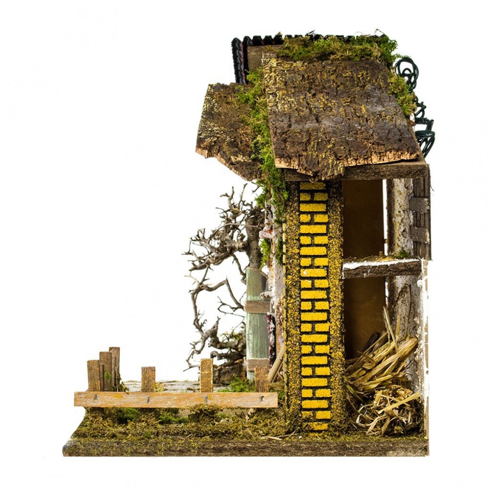 Capanna per la Natività del Presepe. Realizzata in legno e sughero, interamente dipinta a mano, in questa capanna sono state installate delle luci collegate ad una spina 220 Volt. Al suo interno notiamo una scala per il fienile e un casolare antico. Vero muschio, lichene naturale e rami d'albero, per arricchire il contesto. Ideale per personaggi del presepe di altezza massima 17 cm.