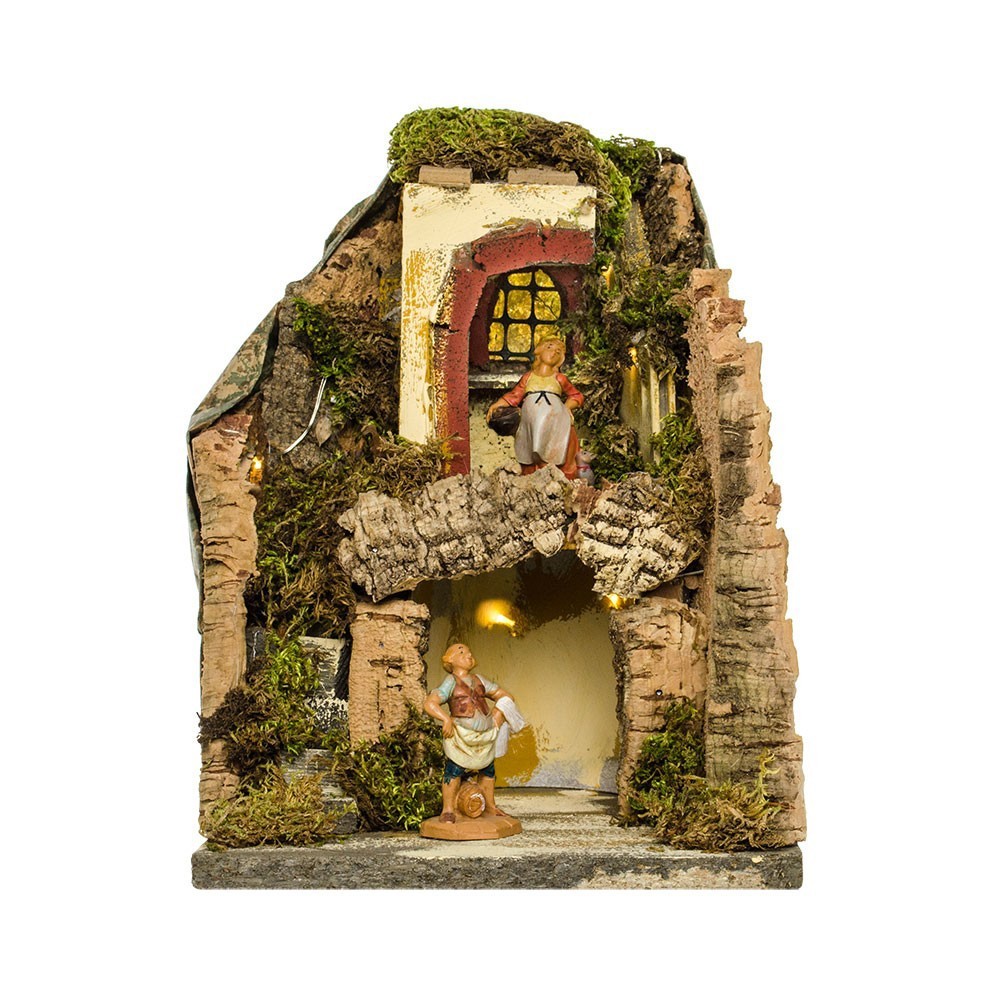 La piccola capanna è adatta a statuine di altezza massimo 4 -6 cm. La capanna è realizzata e prodotta in Itala, con materiali di qualità legno, sughero e muschio. Dotata di 10 luci batteria, bisogna inserire 3 pile AA da 1.5 Volts (non incluse).