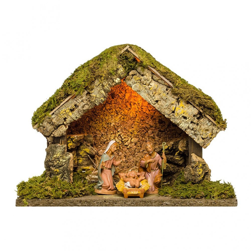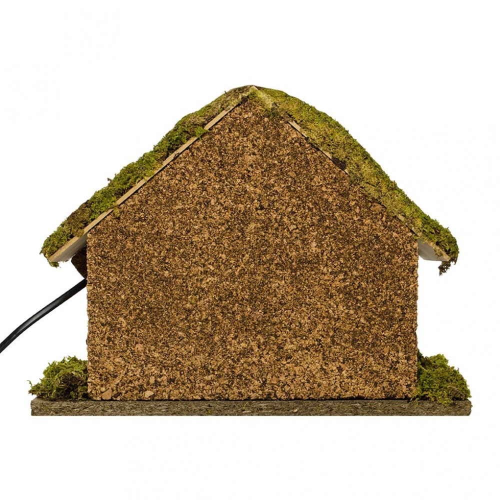 Capanna per la Natività del presepe da 12 cm. La capanna è completa di luci e paglia. Prodotta in Italia utilizzando legno, sughero, paglia e muschio.