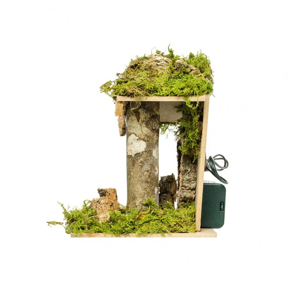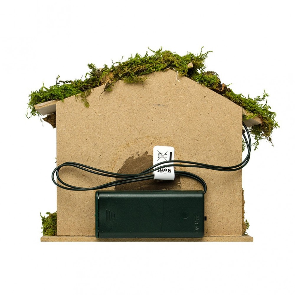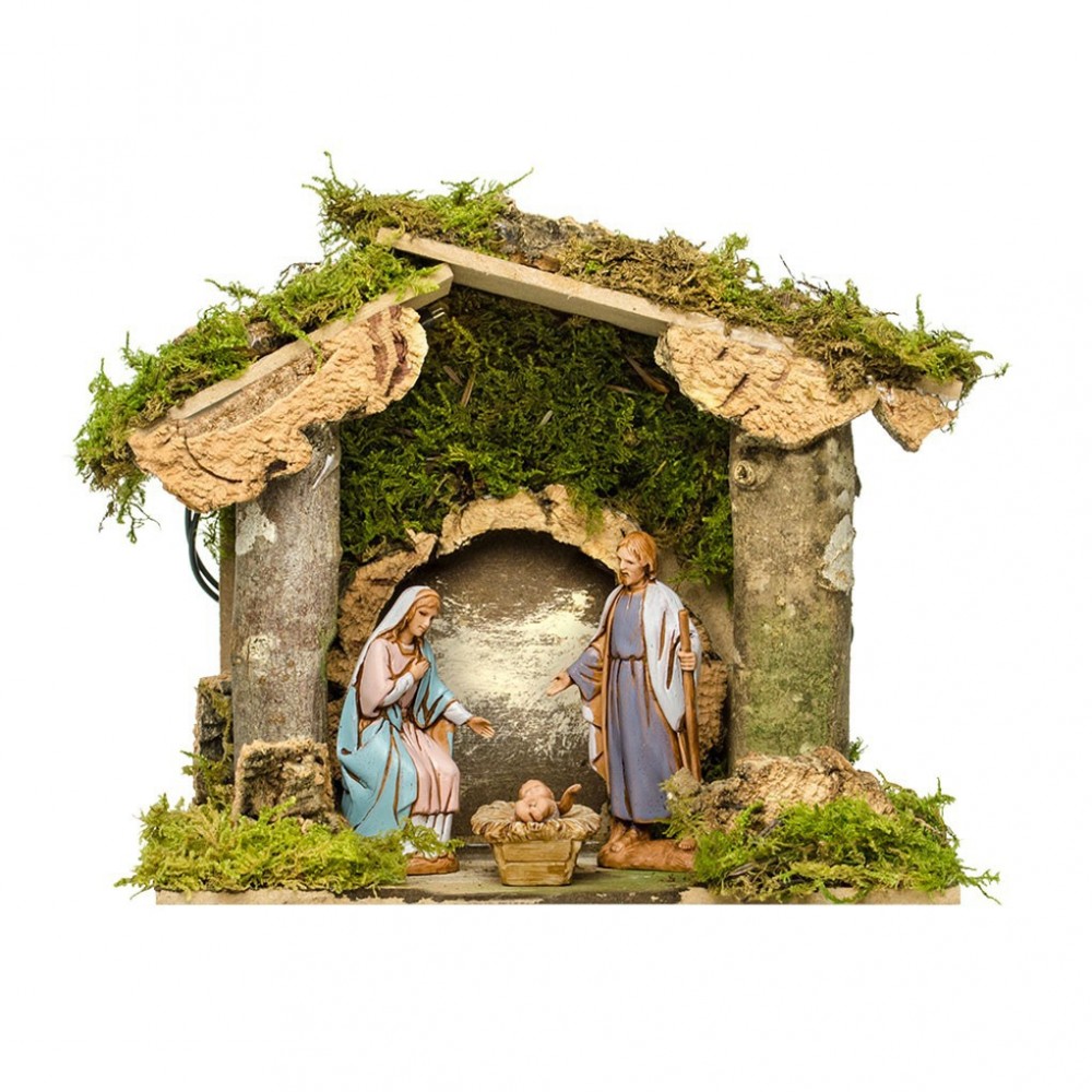 Capanna per la Natività del Presepe da 6,5 cm. Questa capanna è realizzata in legno e sughero naturale, con l'aggiunta di muschio. E' dotata di una lampadina collegata a due batterie stilo da 1,5 v. Ideale per il presepe da 6-6,5 cm.