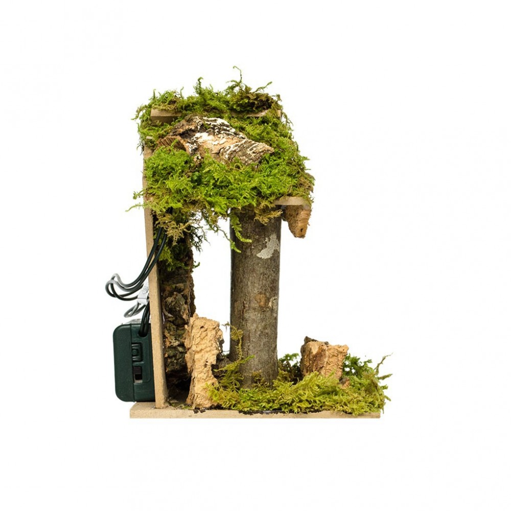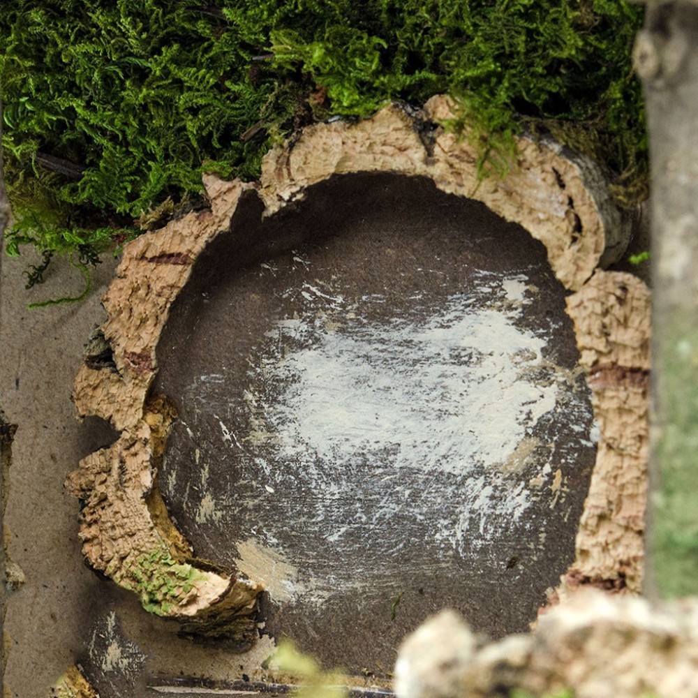 Realizzata in legno chiaro, sughero e muschio.