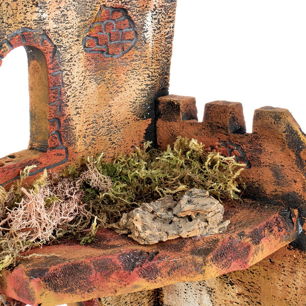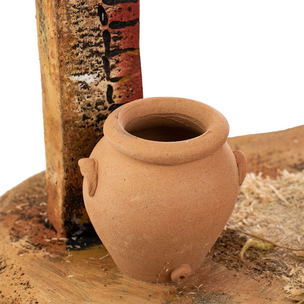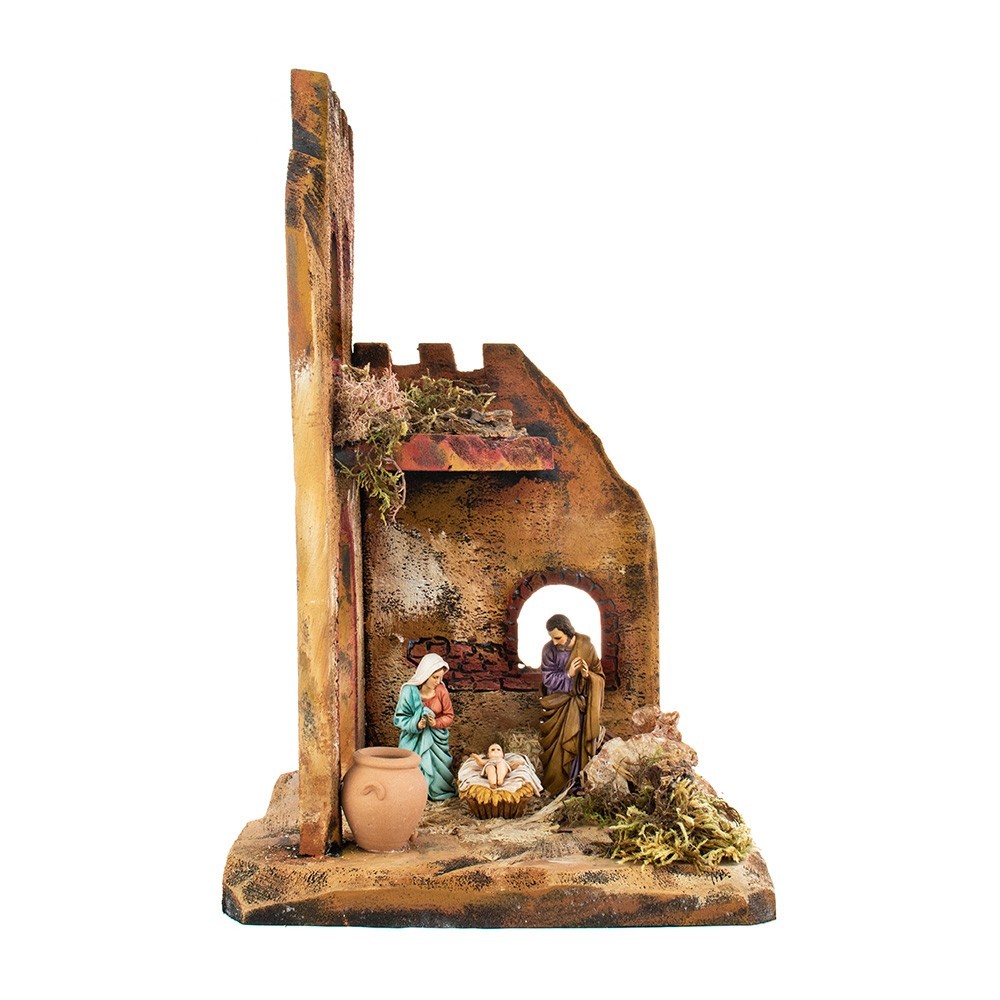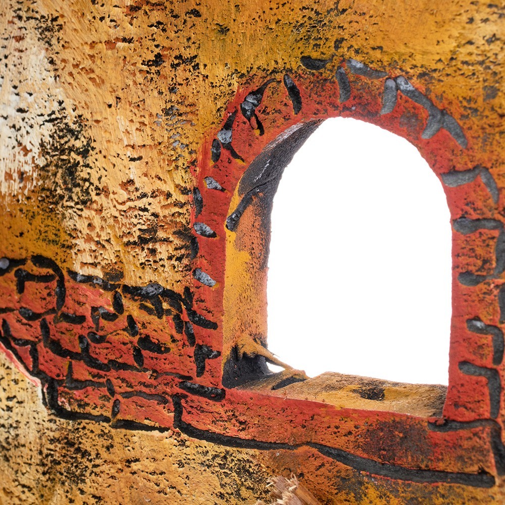 Presepe artigianale in sughero, alto 38 cm, interamente lavorato e dipinto a mano. Grazioso e semplice scenario raffigurante una stalla a due piani a due piani. All'interno di essa sono stati inseriti diversi accessori particolari paglia, fieno, pietre, brocca e archi. Prodotto artigianale made in Italy.