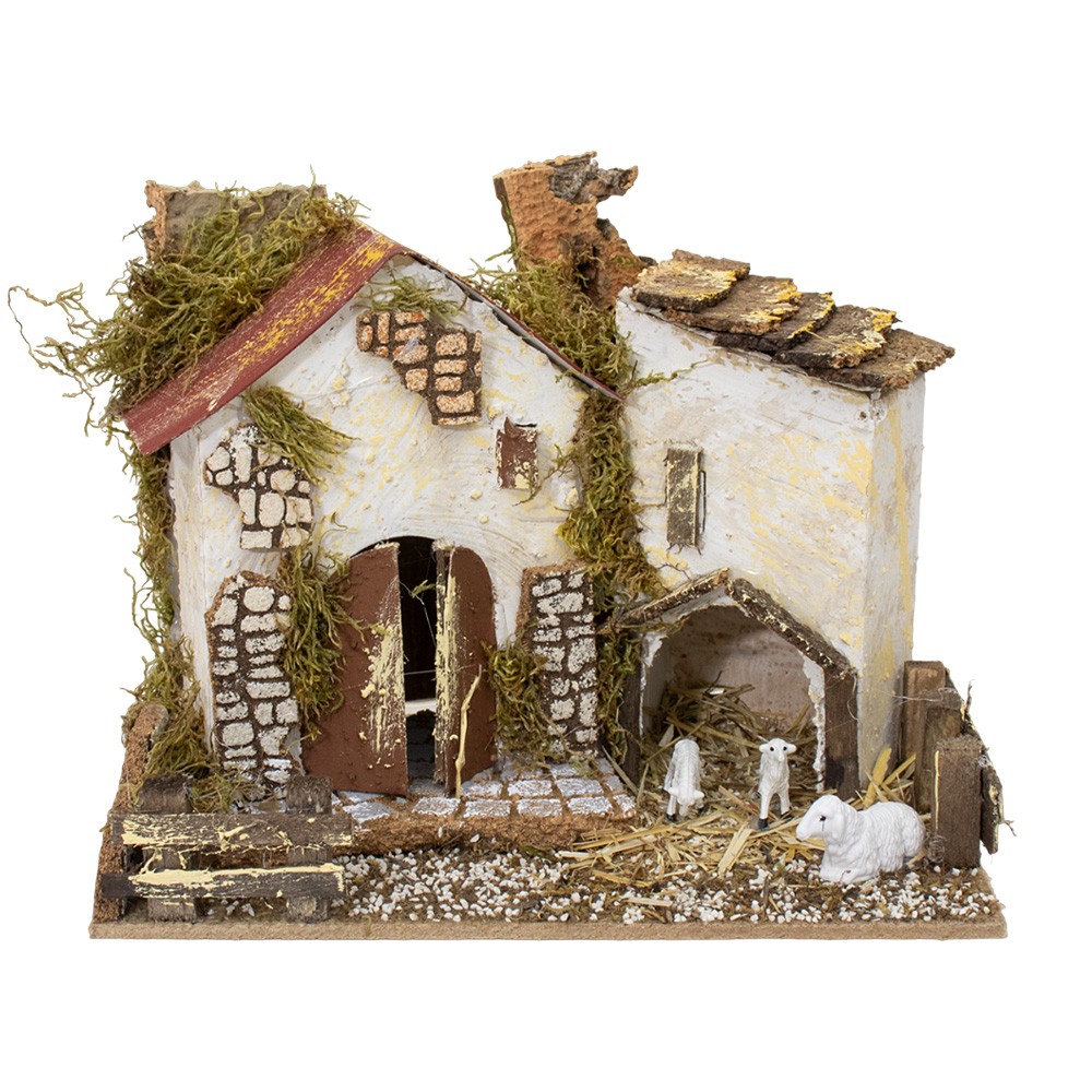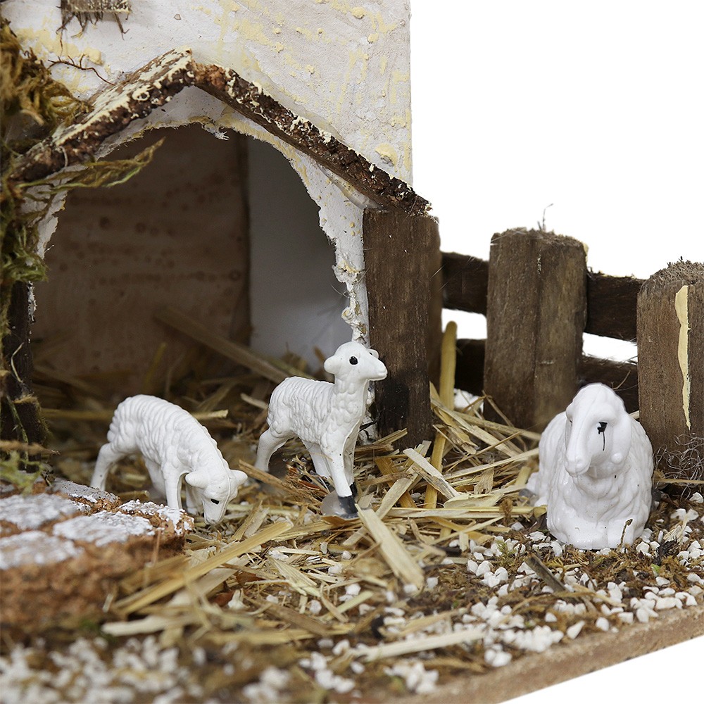 Casolare con stalla e pecorelle adatto per ambientazione presepe di 8-10 cm.