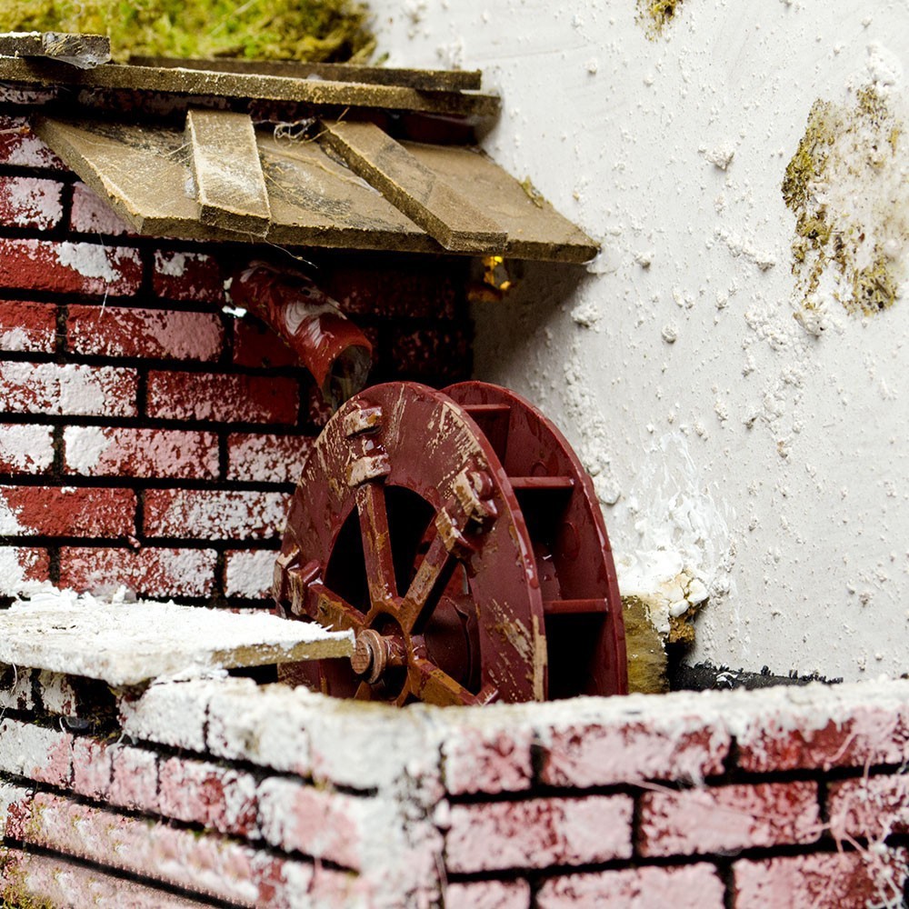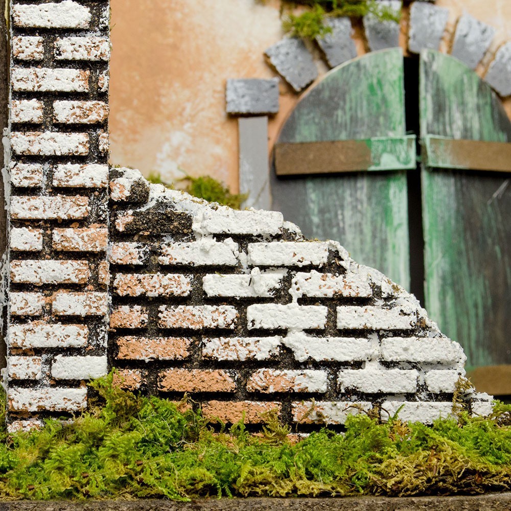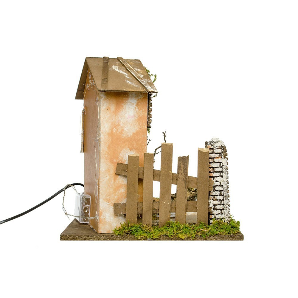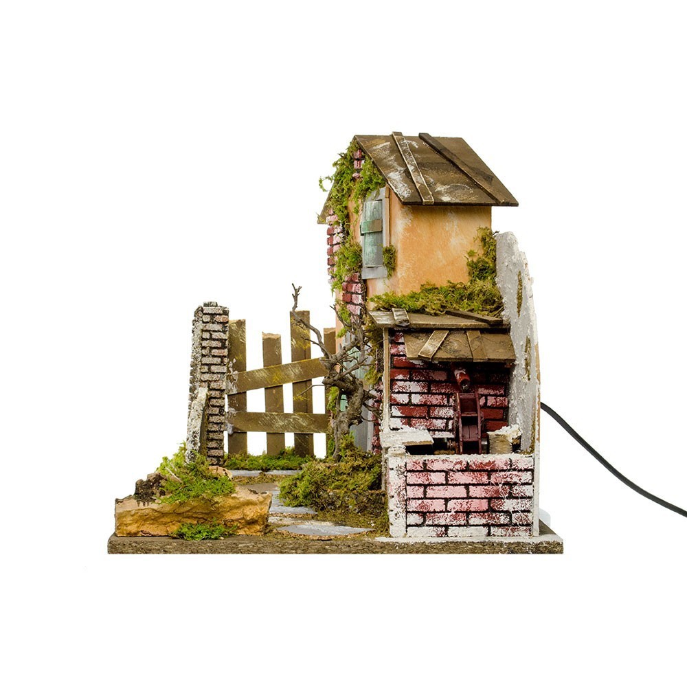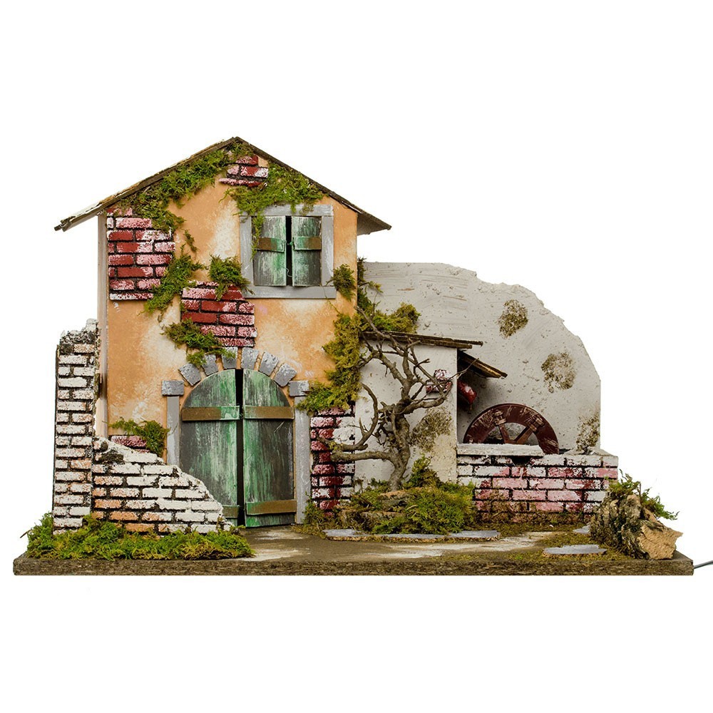 Casolare per il Presepe con 10 luci e Mulino ad Acqua elettrico. Prodotto utilizzando legno e sughero naturale, muschio e lichene vero. Al centro è montato anche un albero realizzato con veri rami . Il mulino ad acqua è funzionante, collegato ad una pompa con spina bipolare da 220 Volt. La staccionata è in legno, mentre lo scorcio del muretto è in sughero lavorato.