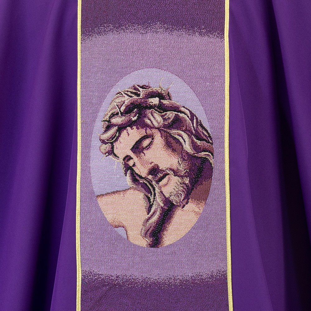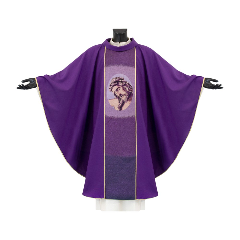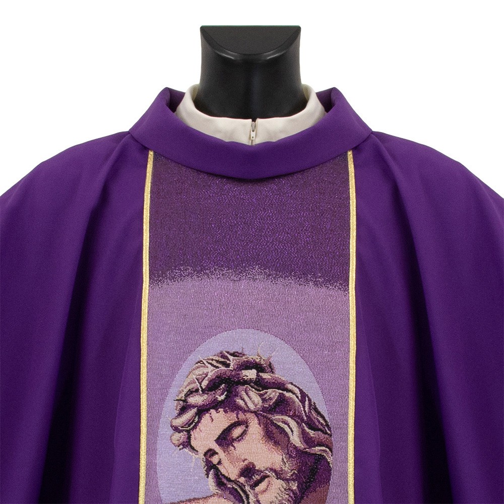 Casula per sacerdote viola con stolone decorato raffigurante il Volto di Gesù Cristo, lavorazione damascata.