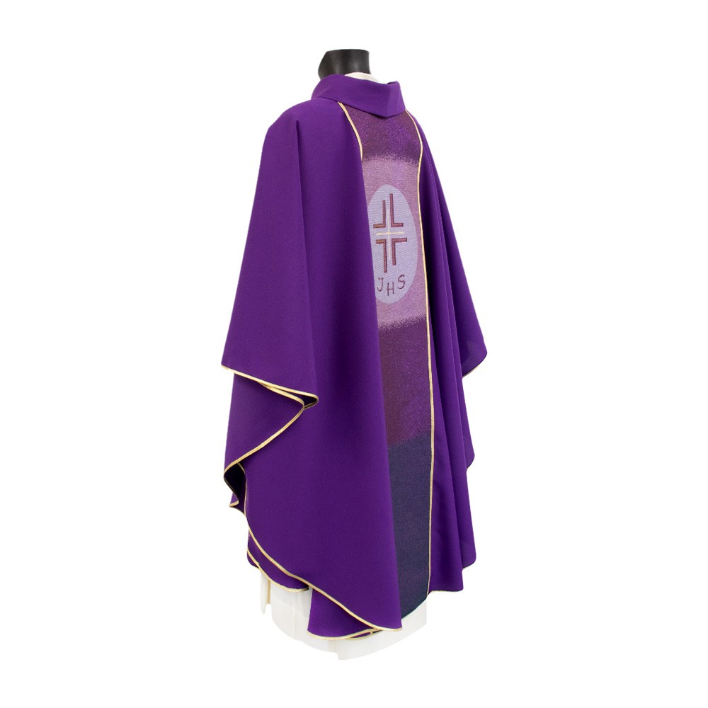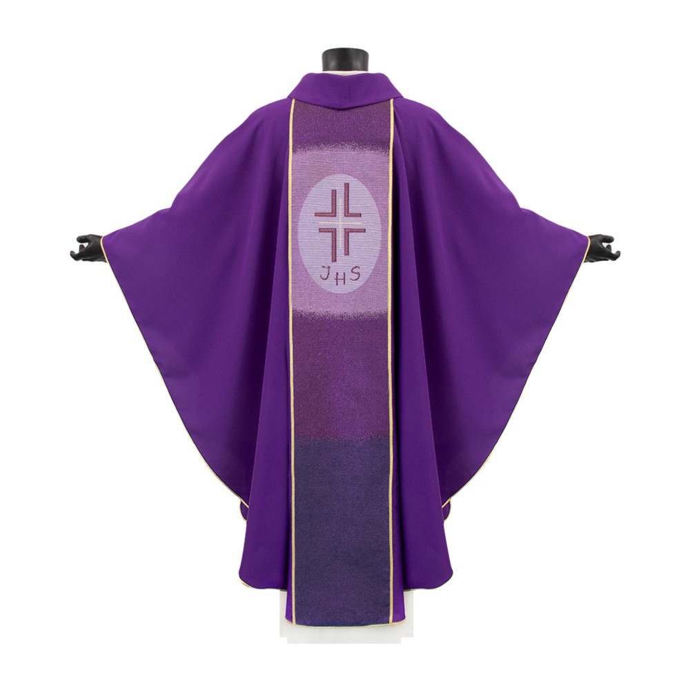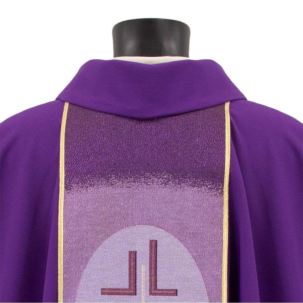 Casula viola in pregiato tessuto Jacquard. Un paramento liturgico elegante e di alta qualità, prodotto in Italia.