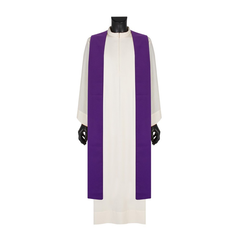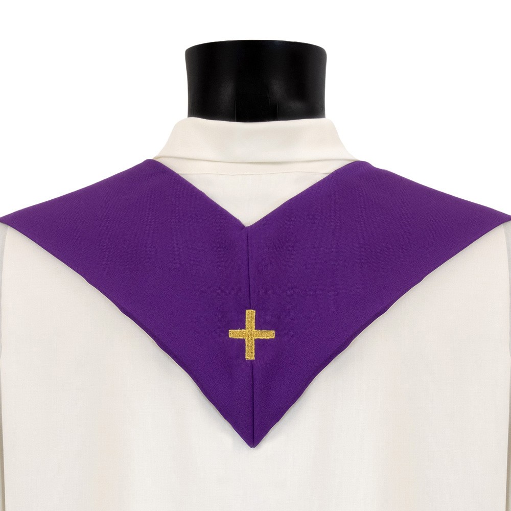 La casula è confezionata in tessuto misto con croci ricamate oro. Modello con collo ad anello e stola abbinata inclusa.