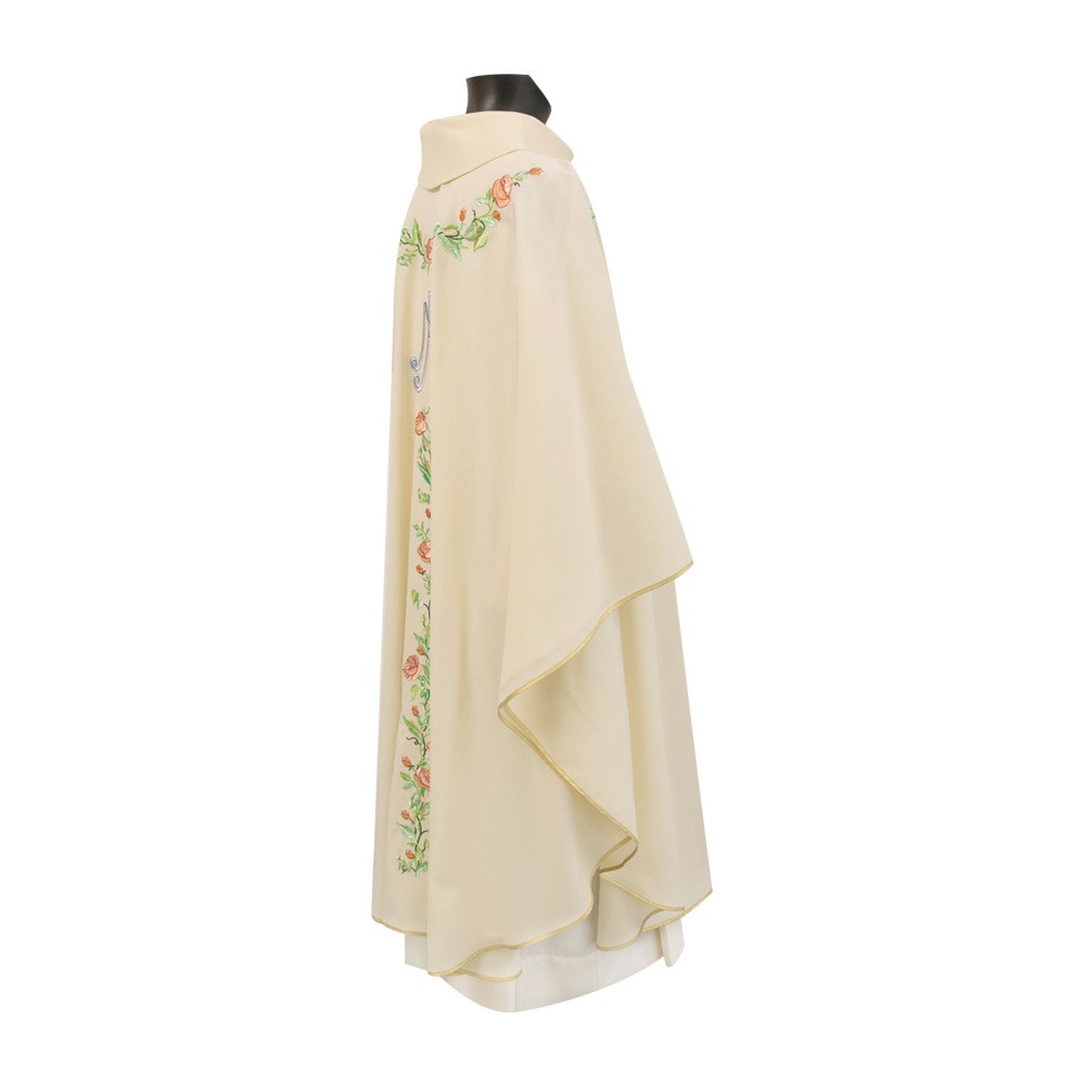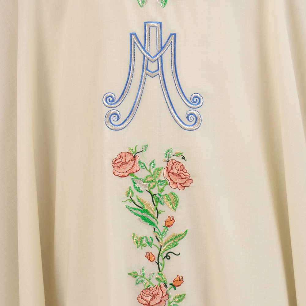 Elegante casula sacerdotale con ricamo Mariano e decori floreali, realizzata in pregiato tessuto pura lana.
